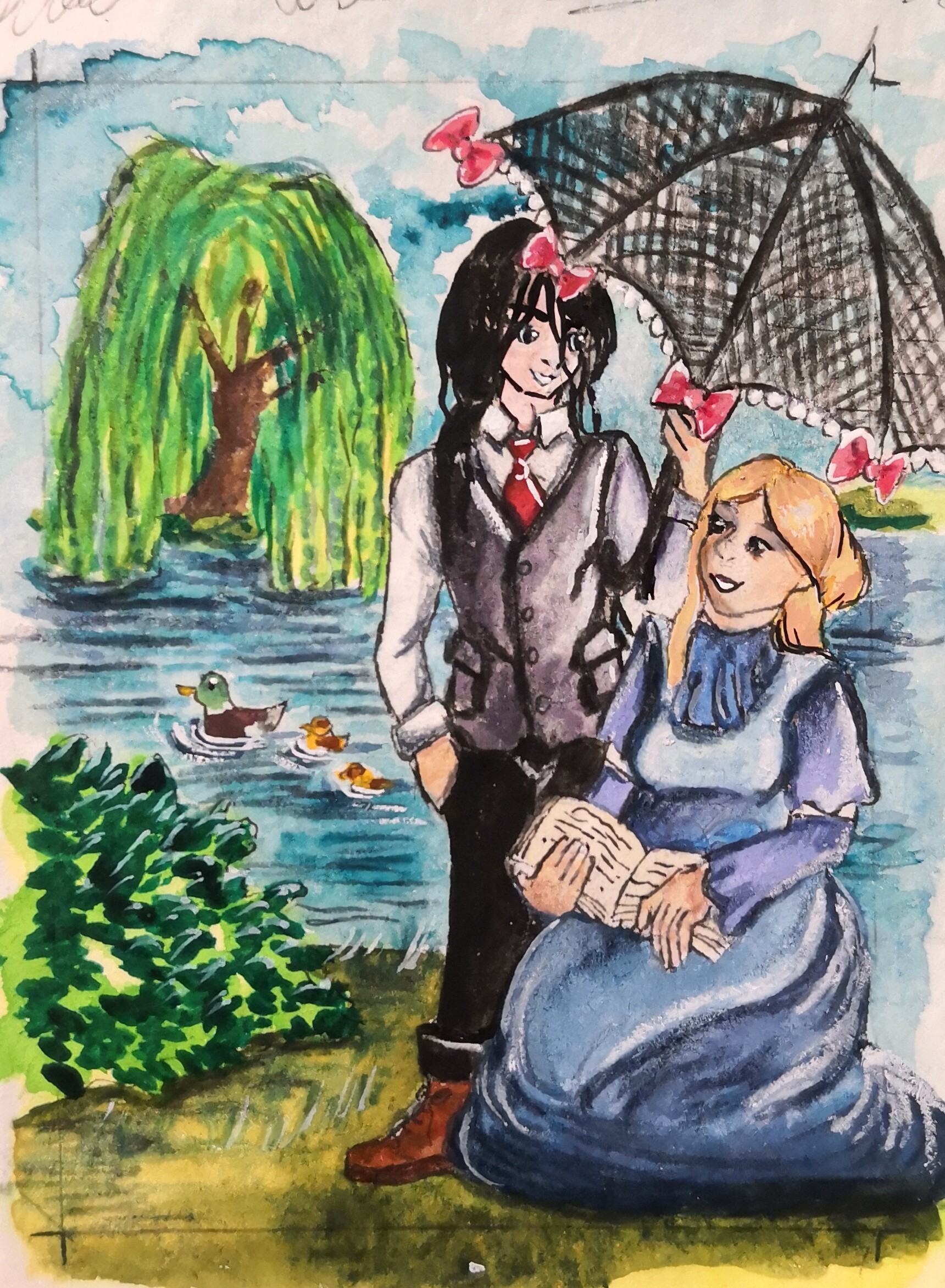 An deiner Karte habe ich am meisten gemacht. Ich hatte Lawrence Hemd komplett vergessen beim Kolorieren. Bei der Gelegenheit habe ich mich nochmal seinem Gesicht und der Hand, die den Schirm hält zugewandt. Das Gesicht habe ich eteas verhunzt (wurde zu dunkel - weil beide ja doch sehr blass sind - , hab versucht es zu radieren hab alles verschmiert, musste also alles nochmal übermalen. Ich hoffe es sieht so jetzt gut aus. Bei der Gelegenheit habe ich seine Haare etwas unordentlicher gestaltet. Die Stirn war sehr “kahl”