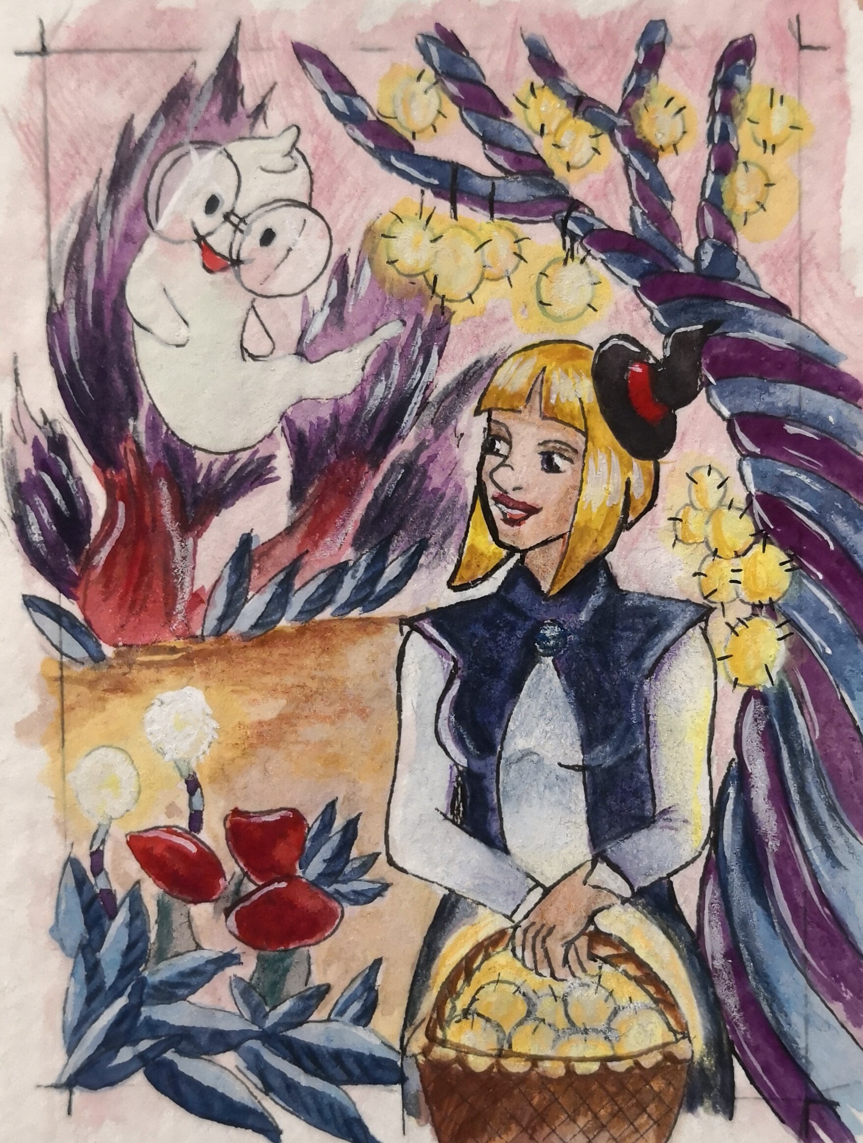 An deiner Karte habe ich am wenigesten nachgearbeitet. Die Früchte vom Baum haben einen leichten orangen Touch bekommen, dass sie leuchtender aussehen, der Korb ist dunkler geworden und ich habe die Schatten in ihrem Oberteil verstärkt.