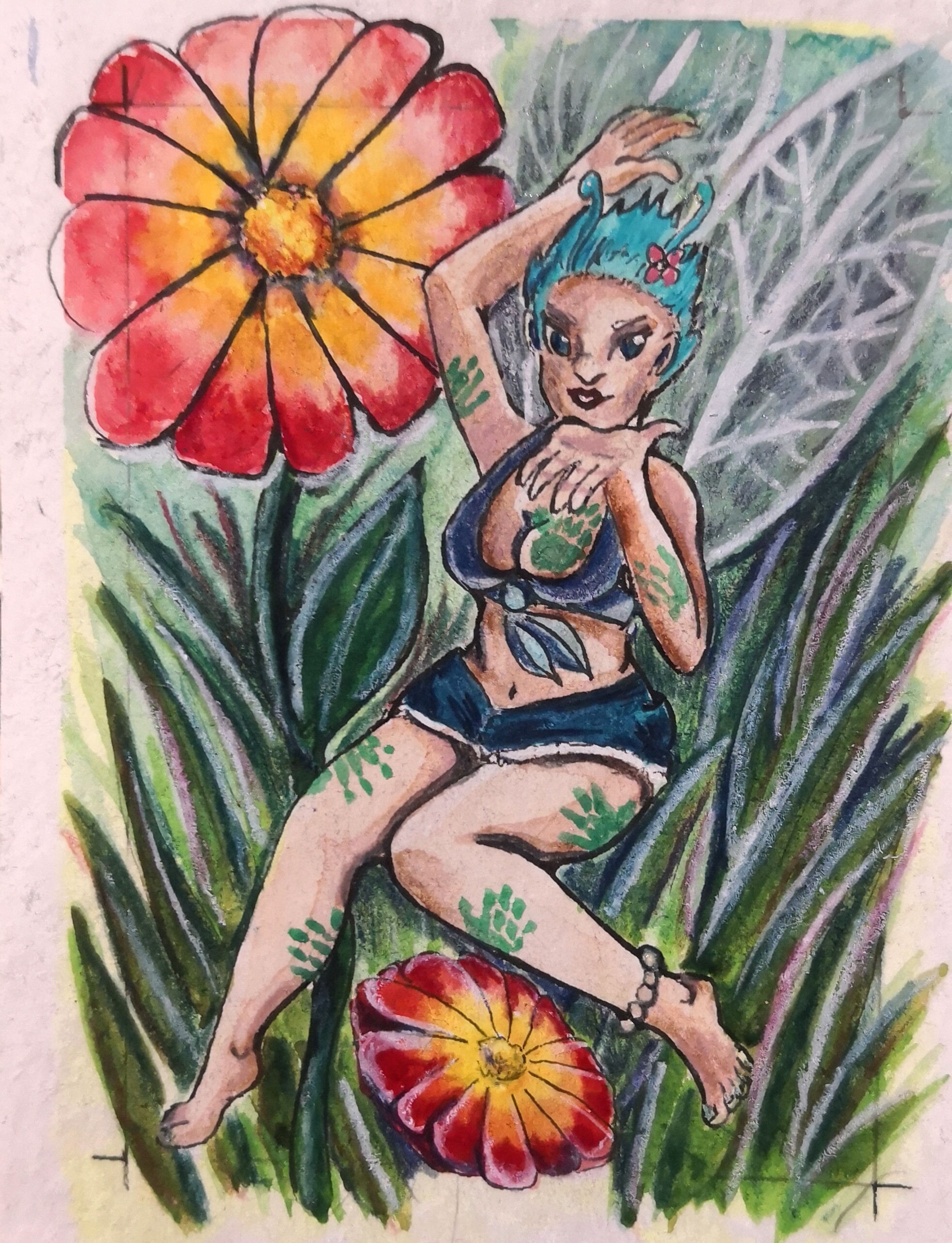Du hattest dich noch gar nicht zu Flit gemeldet. Ich hab die Schatten in ihrer Kleidung und den Haaren etwas verstärkt und den Hintergrund nochmal stärker mit Buntstiften bearbeitet. Die Hand, mit der sie den Kussmund wirft ist besser schattiert und die Blumenstempel sind detailierter koloriert.