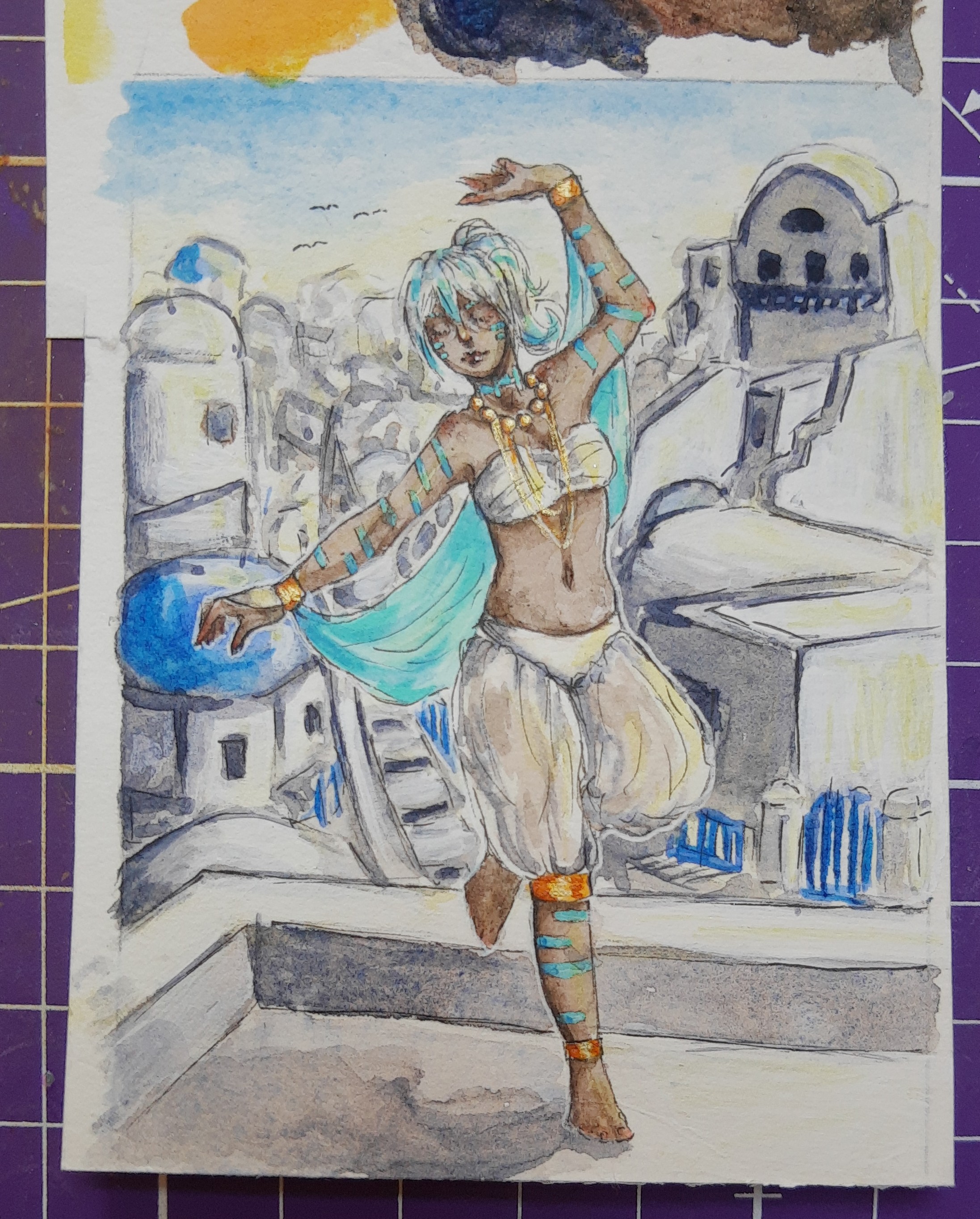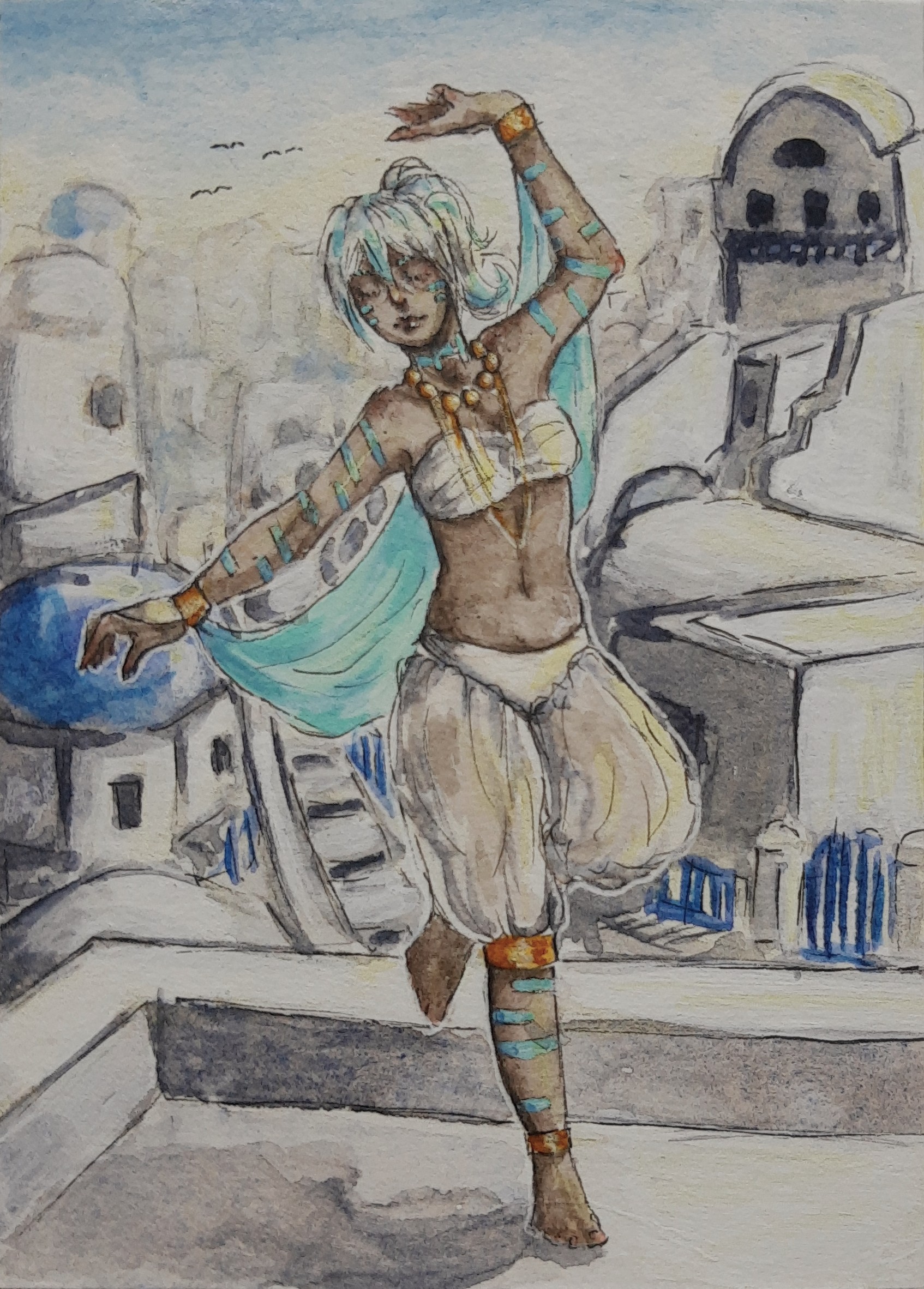 Sie soll auf einem Hausdach stehen und In den Hintergrund würde ich dann eine griechische Stadt machen. Ich hoffe das passt zu ihrem Charakter?
