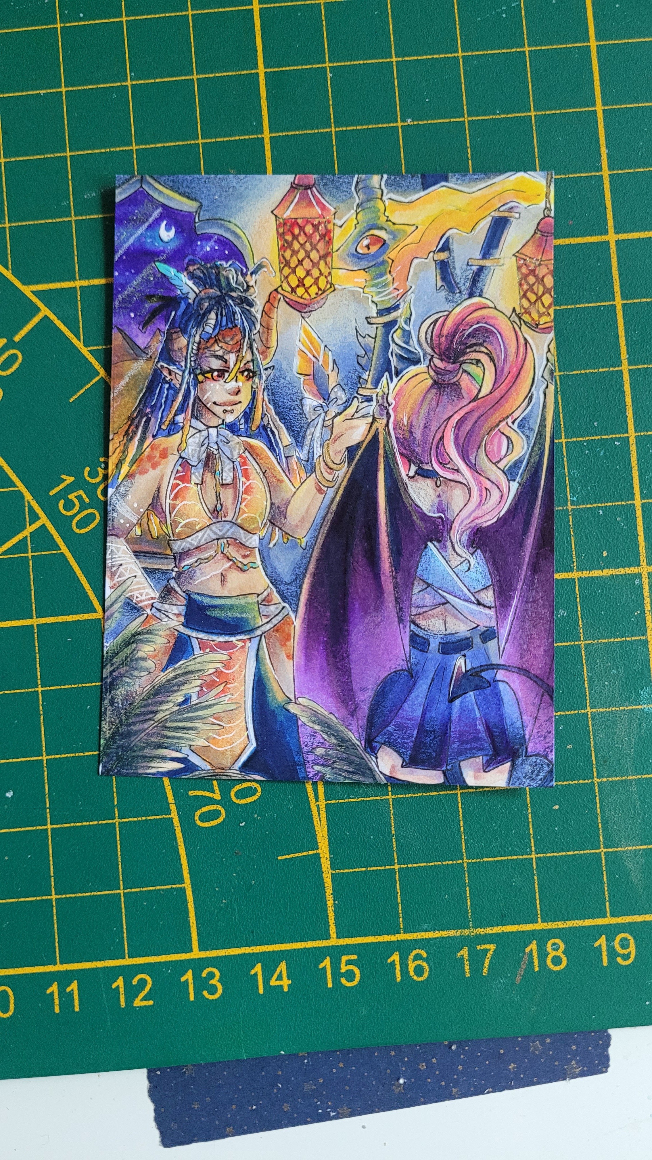Die Linearts der anderen beiden Karten hatte ich heute Mittag verzweifelt gesucht. Aber keine Panik, ich hab am Freitag wohl im Büro meine Mappe mit allen uncolorierten Lines liegen lassen. Da kommt dann morgen der nächste Zwischenstand.