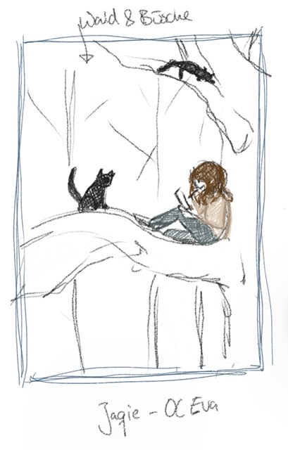 Dein OC Eva im Bau, von Katzen umgeben und am Poesie schreiben (oder lesen?). Für den Hintergrund bin ich mir noch nicht sicher, ich tendiere aber zu grünen Wald und Büschen.