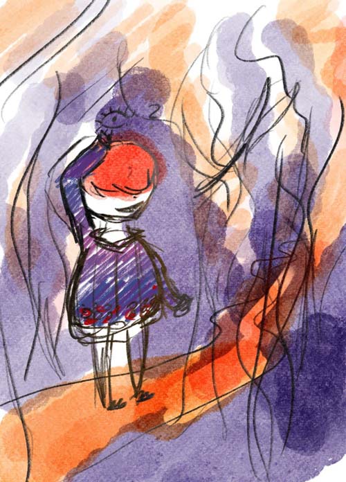 Farben: Lila Wald, Orange Himmel/Weg der ins Rot geht um das Rot vom Haar/Augen aufzugriefen