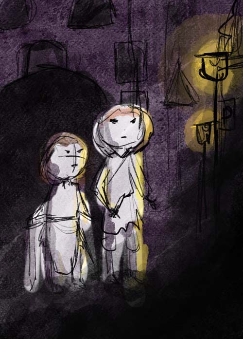 Im Hintergrund auch dunkel, wenige Laternen.