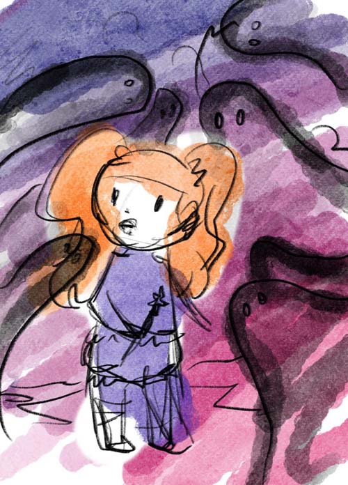 Magical Girl Form, in einem Albtraum, mit gruseligen Schattendämonen die durchscheinend sind, erschrocken aber entschlossen? Oder so?