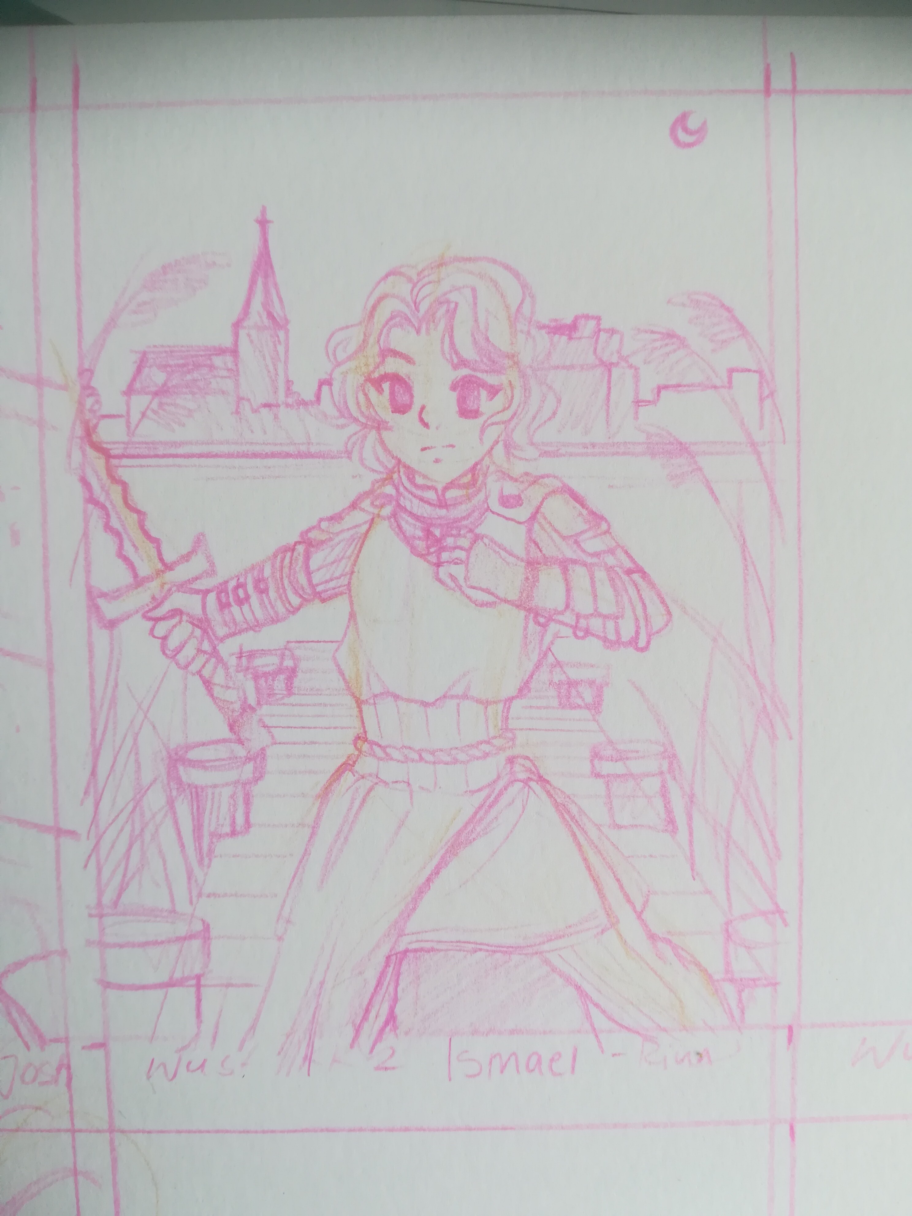 Ich dachte dabei an eine Nachtszene, die “Skyline” von Rostock im Hintergrund nur angedeutet. Ich war leider schon sehr lange nicht mehr dort und weiß nicht ob die Kirche und so jetzt so markant sind, ich hatte die Häuser mit dem Steg davor als Referenzbild gefunden und dachte ein Kampf mit Gefahr im Wasser zu landen hat noch mal eine tolle Dynamik. Wenn du die Idee nicht magst, sag gerne bescheid.
