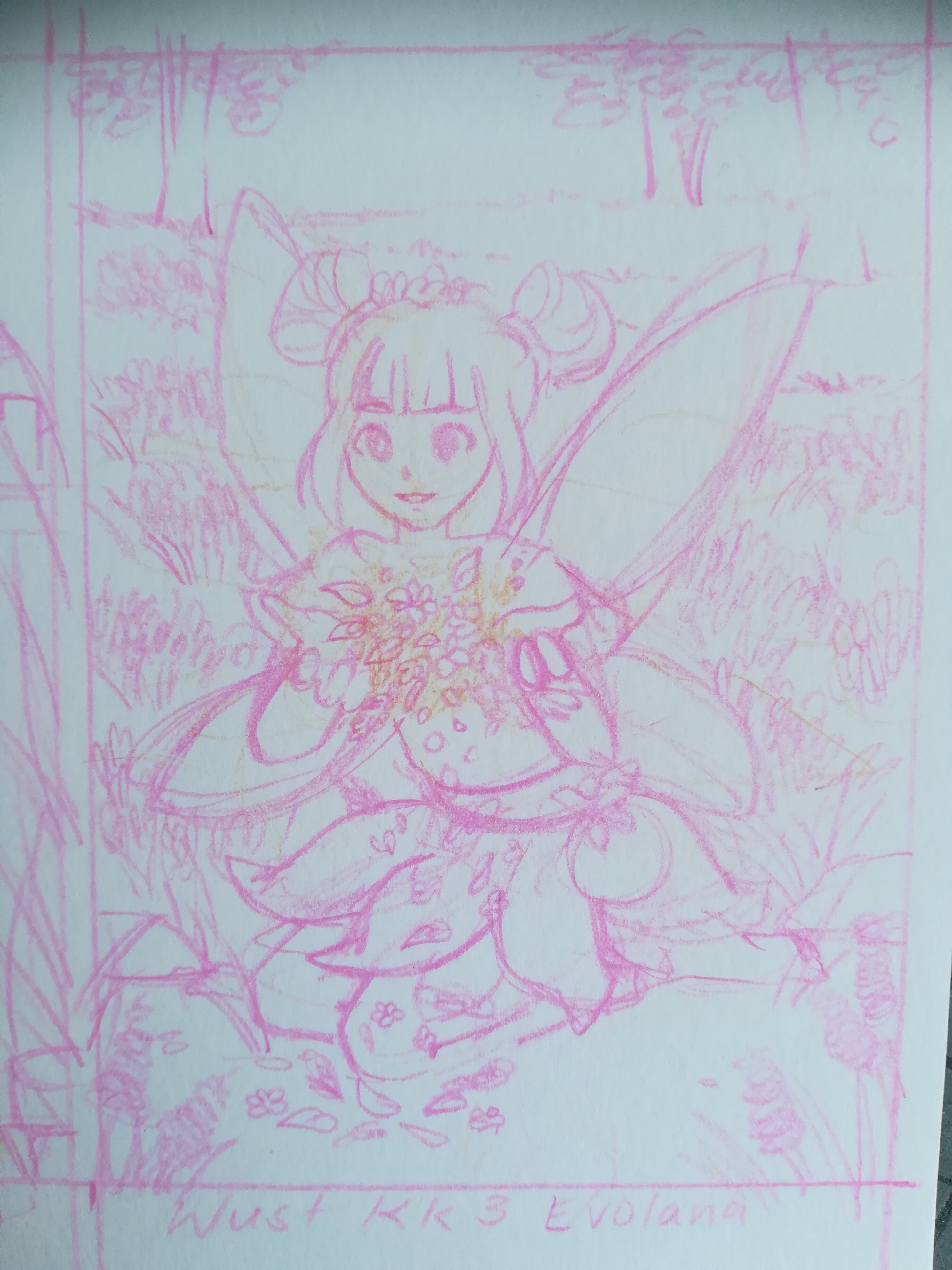 @Evolana würde das so passen? Der Hintergrund ist inspiriert von einem der Bilder auf deiner Pinnwand (die mit den lila Blumen) die habe ich dann auch in der Magie integriert, damit der Ort gewollt ausgesucht wirkt. Ich würde den hauptpunkt der Magie dort wo es jetzt orange angedeutet ist gerne leuchten lassen mit Glitzer und so. Vom Boden schweben die Blätter zur Magie hoch wo sie sich “sammeln”
