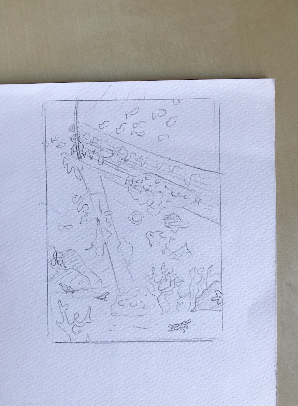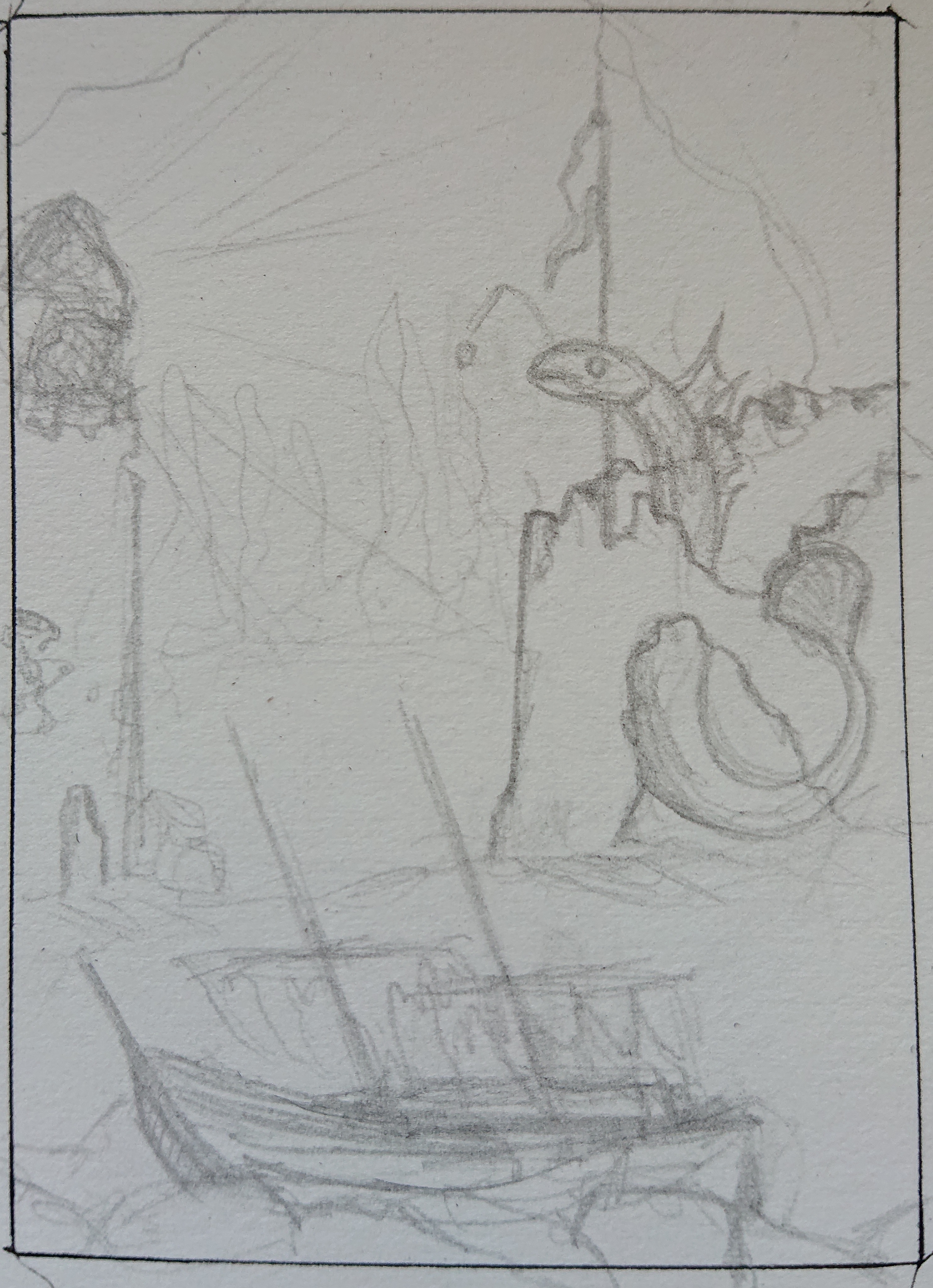 Das links soll ein versunkener Leuchtturm werden. der zwar eine Ruine ist, aber aus irgendwelchen Gründen noch leuchtet und so die Lichtquelle für das Bild darstellt. Ich hoffe man kann es irgendwie erkennen.