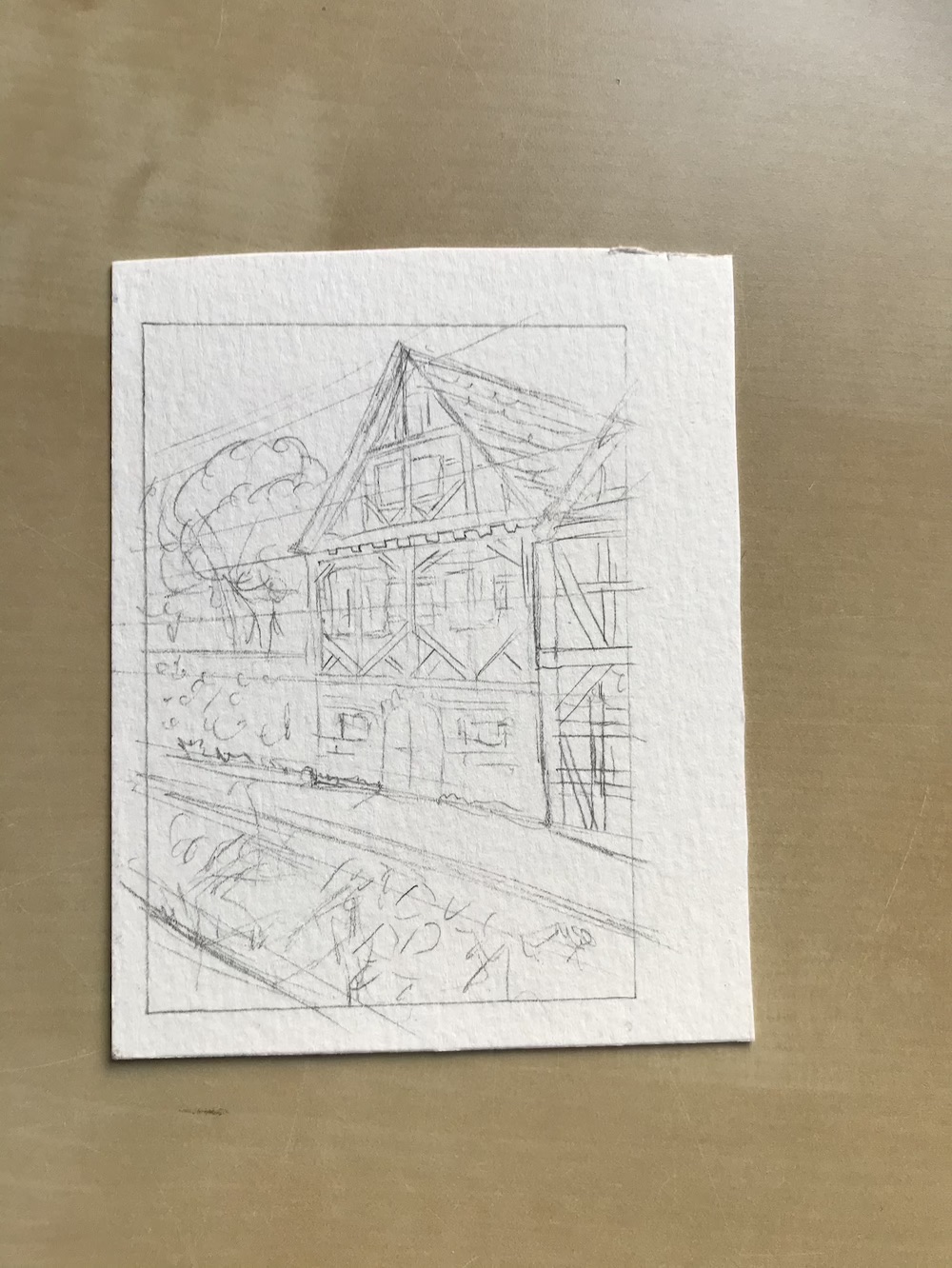 Hier wollte ich die Lines dann mit Tusche und Feder nachziehen, wobei sich dann auch sicher nochmal ein paar Details mehr einschleichen werden, wzb. Pflanzen, Blumentöpfe oder dergleichen. Und das zweite Haus rechts hat natürlich auch noch Fenster, sieht man hier nur schlecht auf der Skizze ;) Links neben den beiden Häusern soll eine Mauer sein, wohinter ein Baum steht (vielleicht ein Apfelbaum?). Ich überlege aktuell noch, wie ich den Straßenbereich davor gestalte, weil der mir aktuell noch etwas leer vorkommt. Ich hatte erst überlegt, einen Brunnen in den Vordergrund einzubauen (Quasi dass die Häuser an einem Markplatz stehen) war mir dann aber nicht mehr so sicher ob das passen würde. Evt. könnte auch eine Bank auf der gegenüberliegenden Straßenseite stehen.