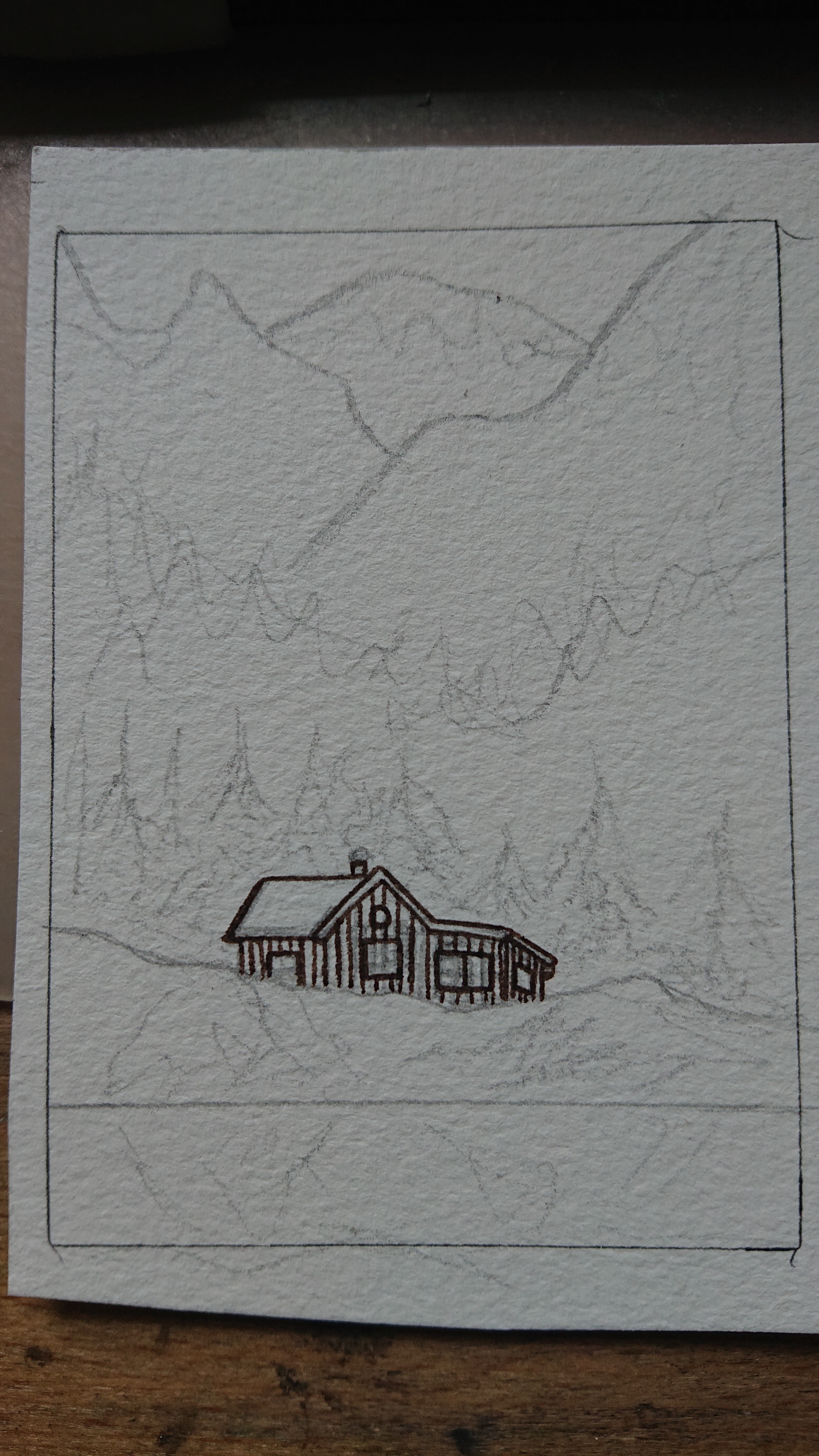 Meine Skizze für Lyfesa, eine Fjordlandschaft. Sorry für die schreckliche Skizze. Es ist eigentlich auch eher eine Konzept Skizze, da ich direkt mit Aquarell arbeiten will.