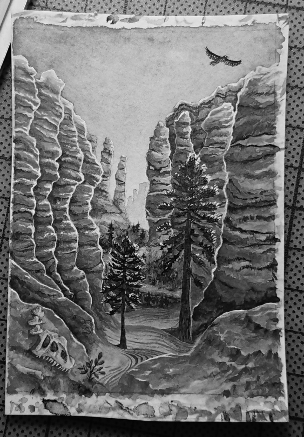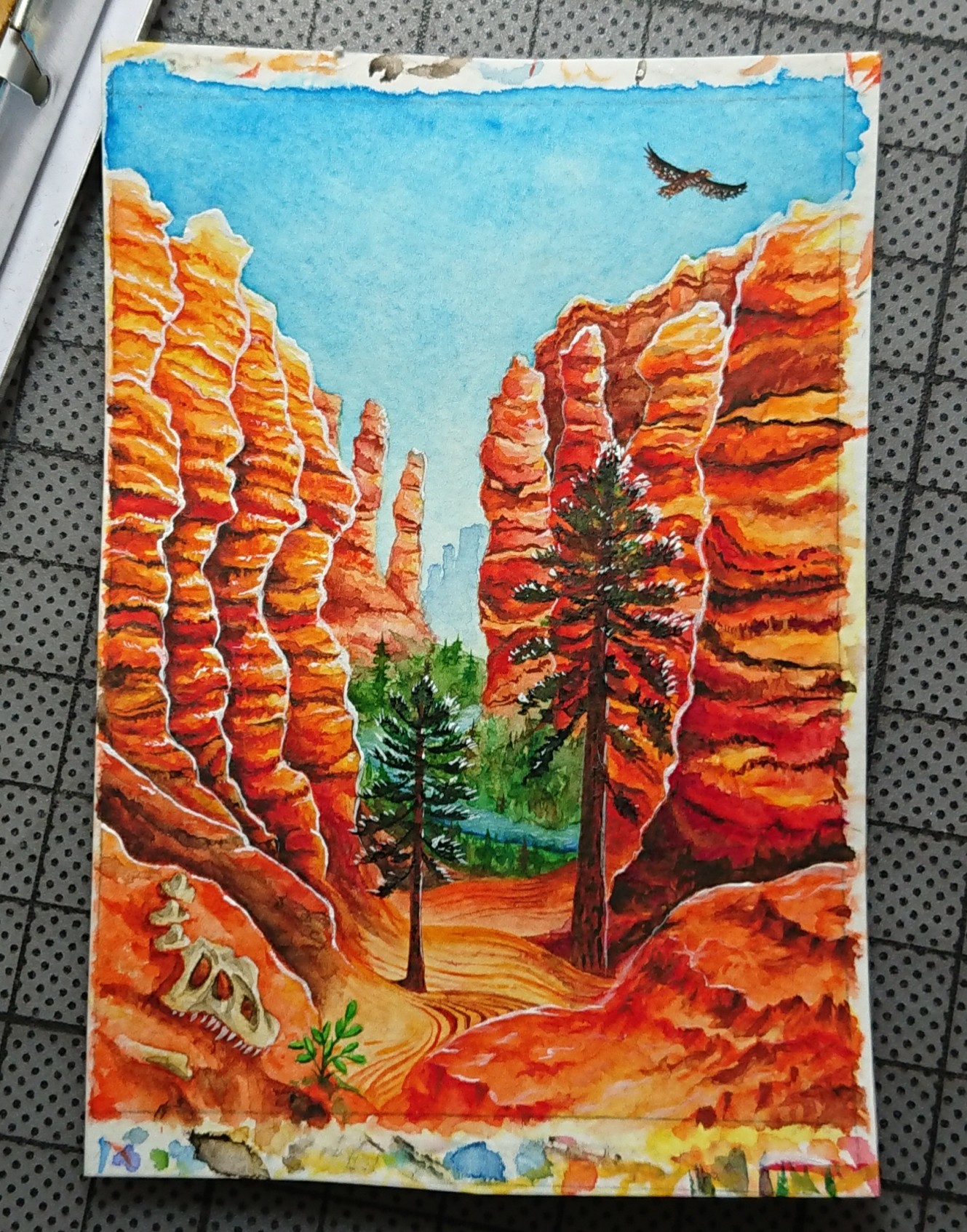 Und ich hab mir noch gedacht “ein Adler wär auch richtig cool im Bild” als ich die Skizze gesehen hab und bei der Knochenfrage musste ich auch sofort an die Dinoknochen denken! So cool, dass du da so viele Aspekte reingebracht hast. Und ich bin auch froh dass ich dich zur Mehrfarbigkeit genötigt hab denn gerade diese verschiedenen Farbschichten in den Canyons sind soooo schön. Danke für die tolle Karte! :D
