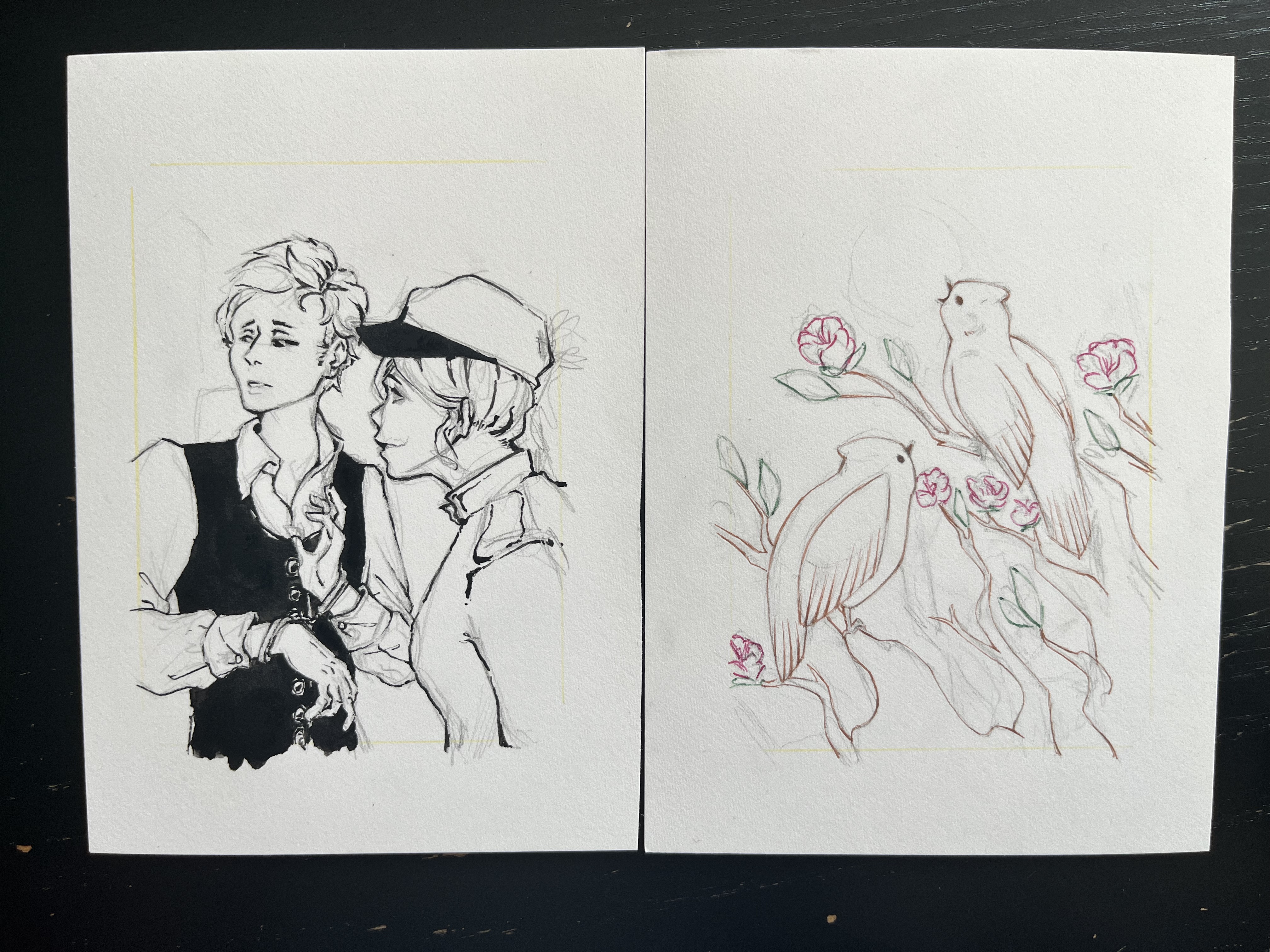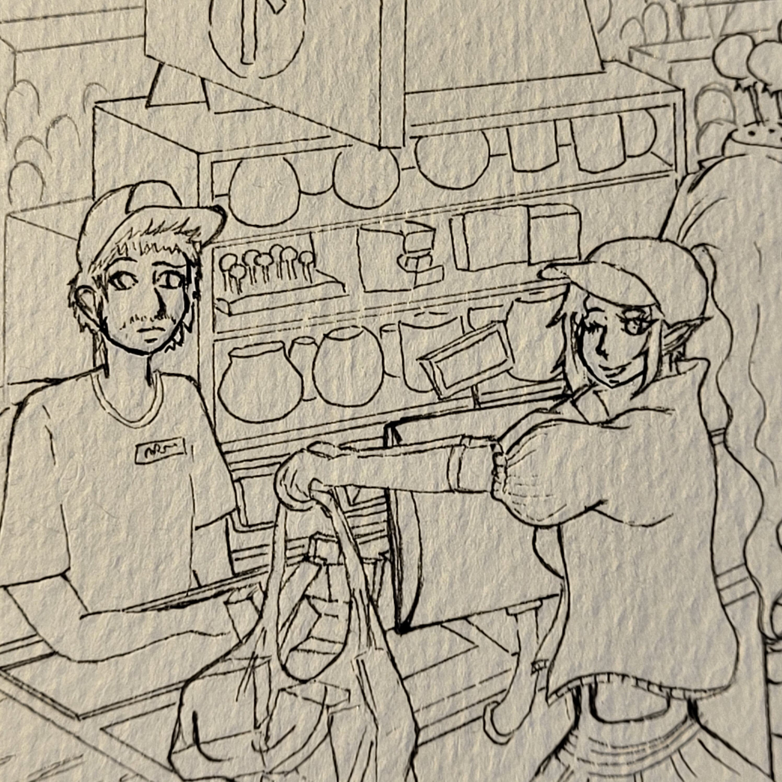 Die Nasen könntest du bei dieser Zeichnung auf jeden Fall noch ändern, da du sie ja bisher nur angedeutet hast. Bei den anderen Sachen kann es schwierig werden das jetzt noch zu ändern. Ich hab überlegt ob ich das schon bei der Skizze ansprechen soll aber hab gedacht dass du den Stil auch wieder anpasst sobald das Motiv steht und wollte dir da nicht zwischenfunken, weil du das bei der Karte für Ismael ja wirklich super gut gemacht hast. Vielleicht kannst du versuchen das so gut es geht zu ändern und dann schauen wir mal. Natürlich geht es vor allem auch darum, dass Solacira sich hier wiedersieht und auch mit der Karte zufrieden ist, deswegen würde ich ihr hier auch das letzte Wort geben. Aber das sind Sachen die mir jetzt aufgefallen sind :)