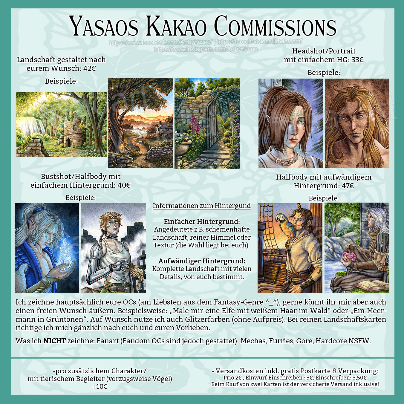Im Moment biete ich hauptsächlich Commissions im Kakaokarten-Format an, aber ab und an gibt es auch mal Spezialangebote wie DinA5 Commissions oder Aufträge in Postkartengröße (auf Anfrage). Meine Preisliste für Kakao-Aufträge findet ihr hier im nachfolgenden Spoiler: