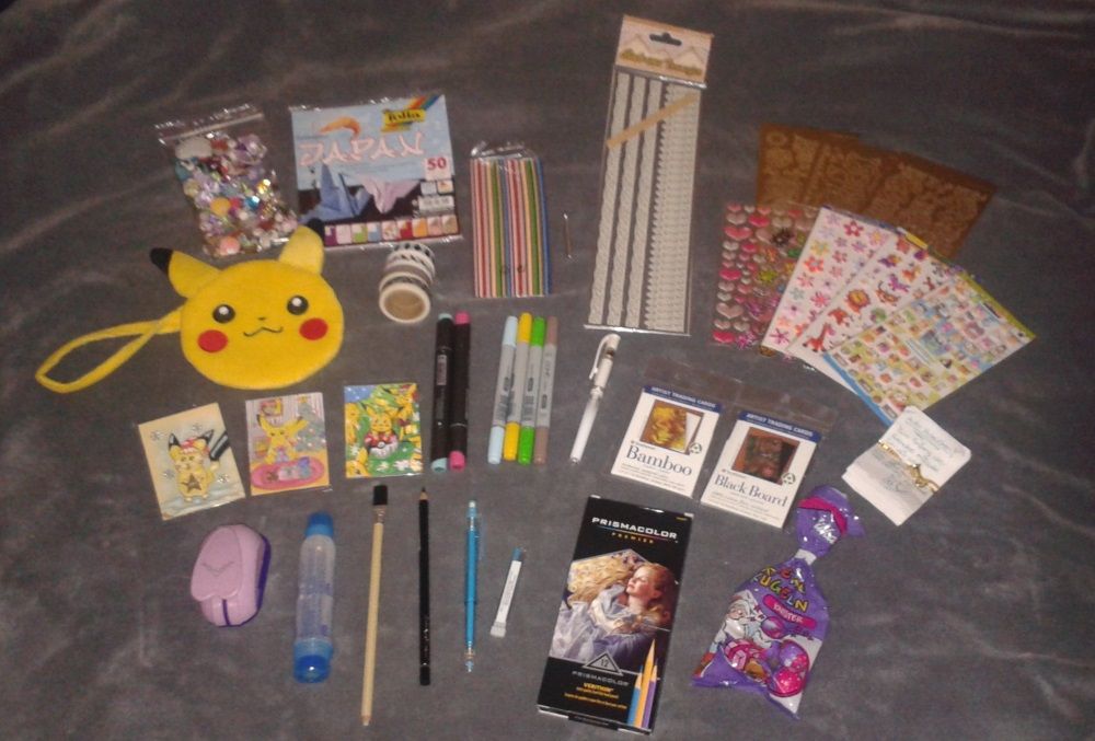 Ein Molotow Marker in der Farbe ‘Putty’, ein weiterer flacher Pinsel, Polychromo ‘rotviolett hell’, ein süßes kleines Eau de Parfum, Schokolade in den interessanten Kreationen ‘zartbitter waldfrucht’ (fand ich durch den Beerengeschmack sehr lecker), ‘weiße rosa Apfelbeere’ (hab ich auch schon probiert, die mit den Waldfrüchten war aber etwas eher mein Fall), ‘zartbitter brombeer’, Copic Ciao Marker ‘Salmon Pink’ ein kleines Döschen ‘Moringa Body Butter’, ein Lush ‘Apple Jam’ Duschgel, das ich heute schon benutzt hab (schöner Duft <3 allerdings war das Döschen von außen schon etwas klebrig, hast du das deshalb in den Copic Behälter getan als Schutz? xD), eine Tagescreme von Yves Rocher, nochmal zwei weitere Sakura Micron Liner, Origamipapier (das hat mich gefreut, ich würds nämlich gern ausprobieren, mal was schönes zu falten), eine goldene Tusche von Winsor & Newton (die hab ich schon, steht aber nicht auf meiner Liste drauf -> also mein Fehler), ein Buch mit Liebesgedichten, ein Buch namens ‘Rot und Schwarz’, ein Manga mit dem Titel ‘Götterboten’, eine Haarspange aus Sonnenblumenkernen mit ein paar Streuseln in der Mitte. Hast du die selbst gemacht oder irgendwo gekauft? So etwas habe ich noch nicht gesehen bisher, aber das mit den Sonnenblumenkernen ist mal eine Idee.