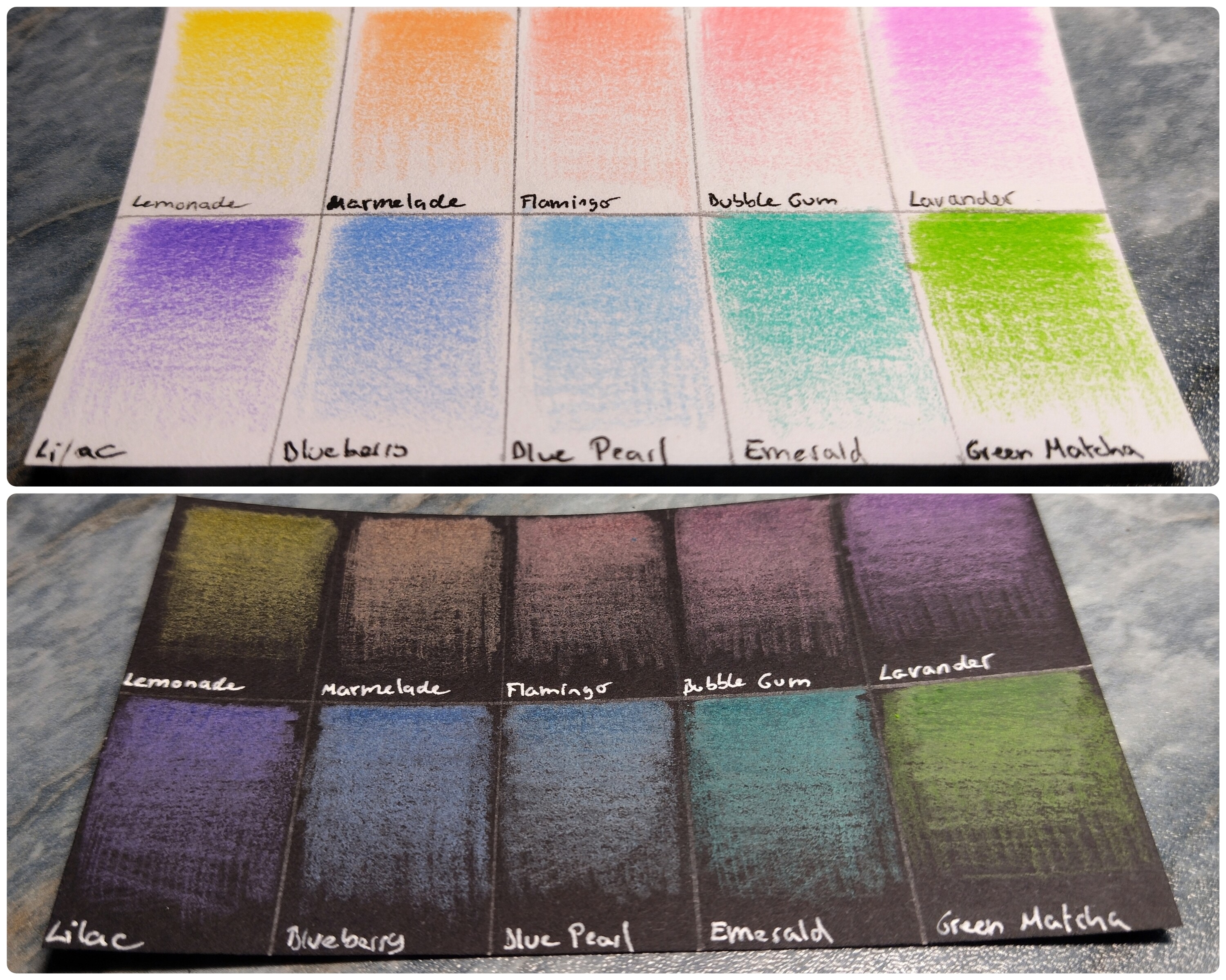 Hier sind ein paar Fotos, inklusive Swatches auf weißem und schwarzem Papier: