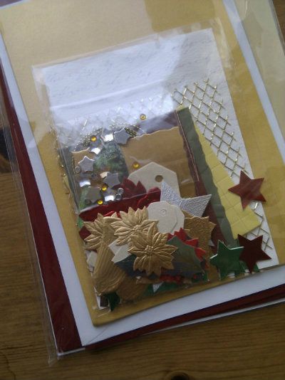 Übrigens gibt es gerade bei ** Lidl** kleine Weihnachts-Bastelsets im Angebot für 1,99€ . Darin enthalten sind jeweils zwei Karten (eine in metallic, eine in matt), ein paar kleine Bogen Motivpapier, Gold/Silbernetz und eine kleine, aber sehr feine Auswahl an ausgestanzten Motiven und Strasssteinchen. Gedacht ist das Ganze dazu, Weihnachtskarten zu basteln, aber das ganze Material kann man meiner Meinung nach super für Kakaos benutzen. :)