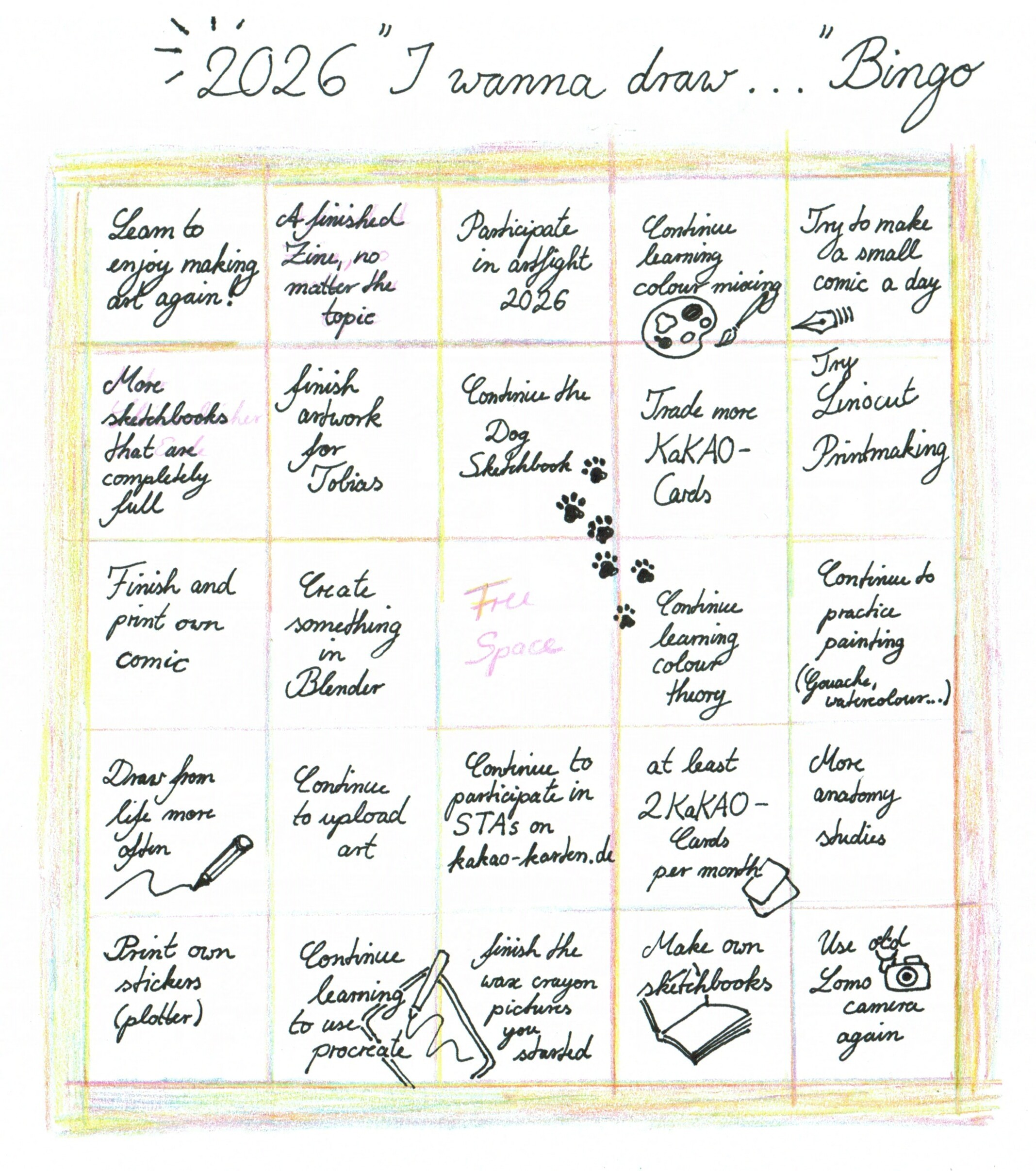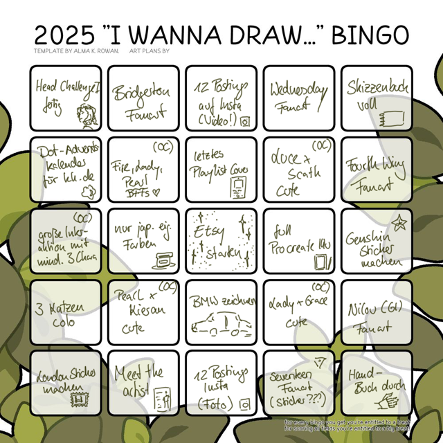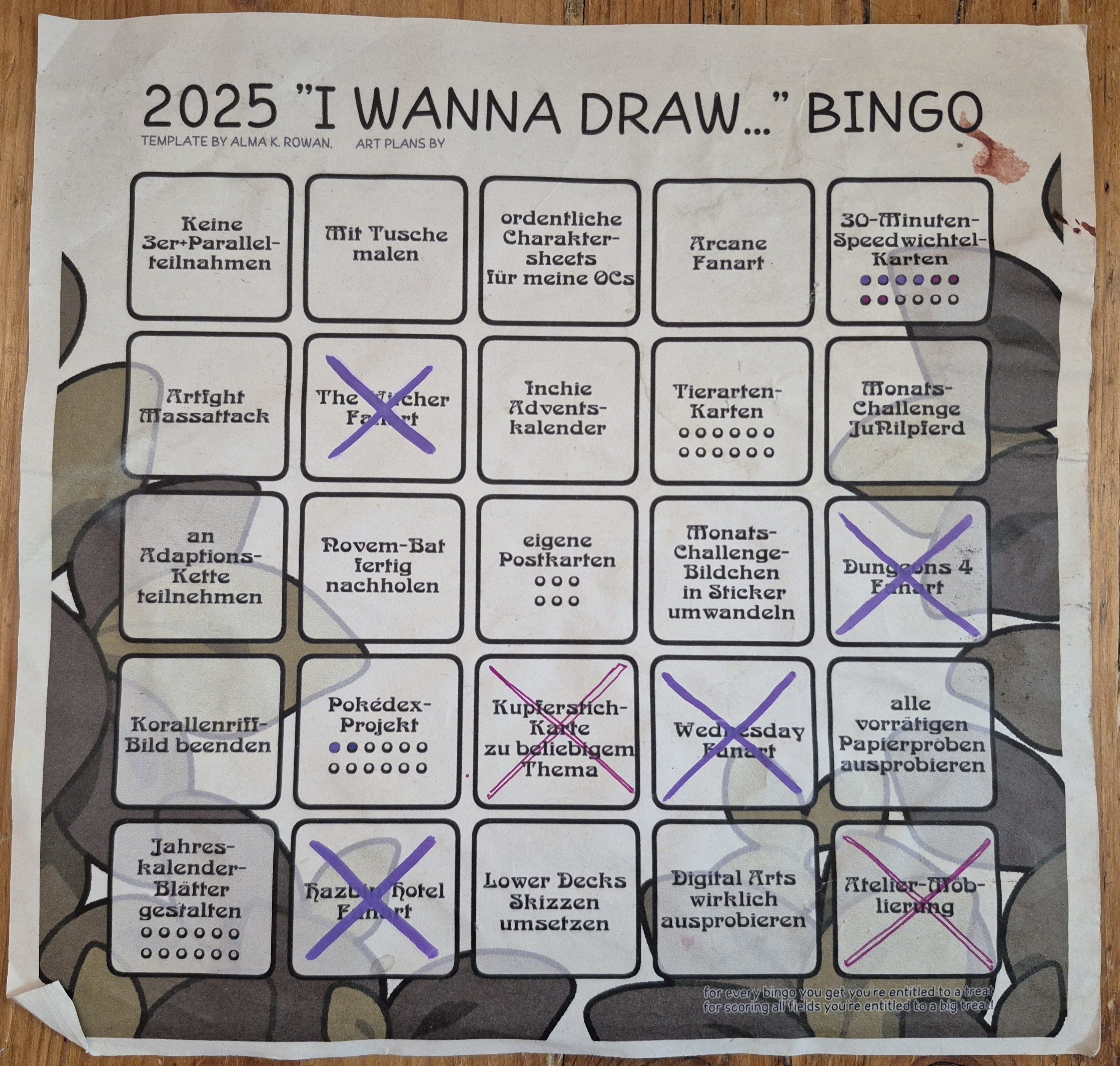 Mein Bingo von letztem Jahr will ich gar nicht mehr so genau anschauen, es war leider zeichnerisch gar kein gutes Jahr für mich… ich bin wieder total in dieses “nur zeichnen, wenn ich ne Deadline im Nacken habe” gefallen, was halt auf mehreren Ebenen doof ist :/ Ich hab die ganze Zeit den Zeitdruck, aber auch den Druck, dass es gut werden muss (weil Deadline ja üblicherweise heißt, dass es für eine Aktion oder so ist). Also kann ich nicht experimentieren, weil da kann ja was schief gehen und ich bin nicht so sicher darin. Aber irgendwie bin ich auch nicht ganz zufrieden mit dem, was ich aktuell zeichne, aber Sachen ausprobieren geht ja nicht wirklich, weil xy muss bis zur Deadline fertig sein und so weiter und so fort.