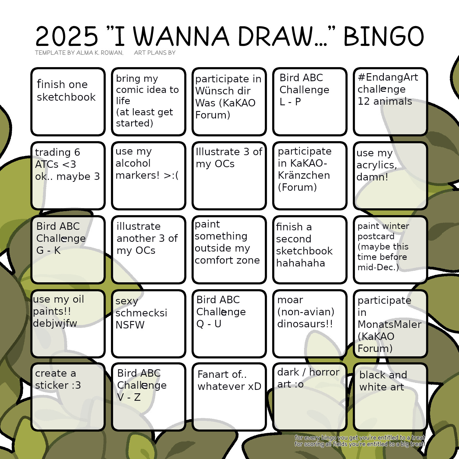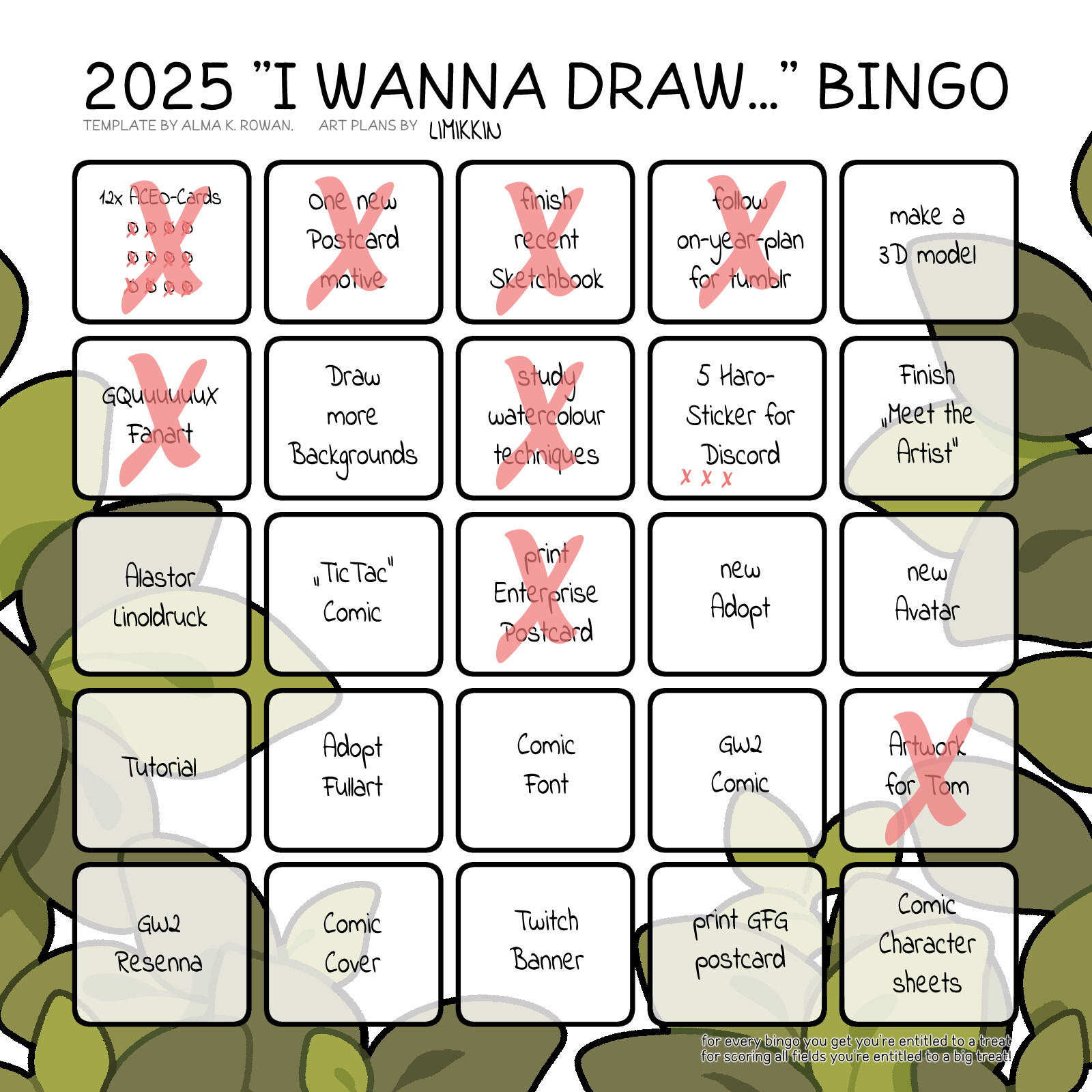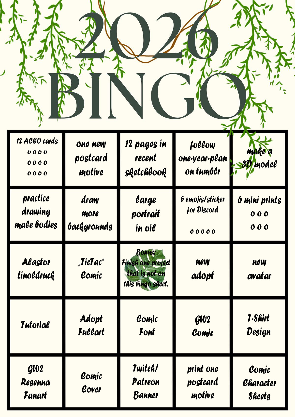 Mein Bingo von letztem Jahr will ich gar nicht mehr so genau anschauen, es war leider zeichnerisch gar kein gutes Jahr für mich… ich bin wieder total in dieses “nur zeichnen, wenn ich ne Deadline im Nacken habe” gefallen, was halt auf mehreren Ebenen doof ist :/ Ich hab die ganze Zeit den Zeitdruck, aber auch den Druck, dass es gut werden muss (weil Deadline ja üblicherweise heißt, dass es für eine Aktion oder so ist). Also kann ich nicht experimentieren, weil da kann ja was schief gehen und ich bin nicht so sicher darin. Aber irgendwie bin ich auch nicht ganz zufrieden mit dem, was ich aktuell zeichne, aber Sachen ausprobieren geht ja nicht wirklich, weil xy muss bis zur Deadline fertig sein und so weiter und so fort.