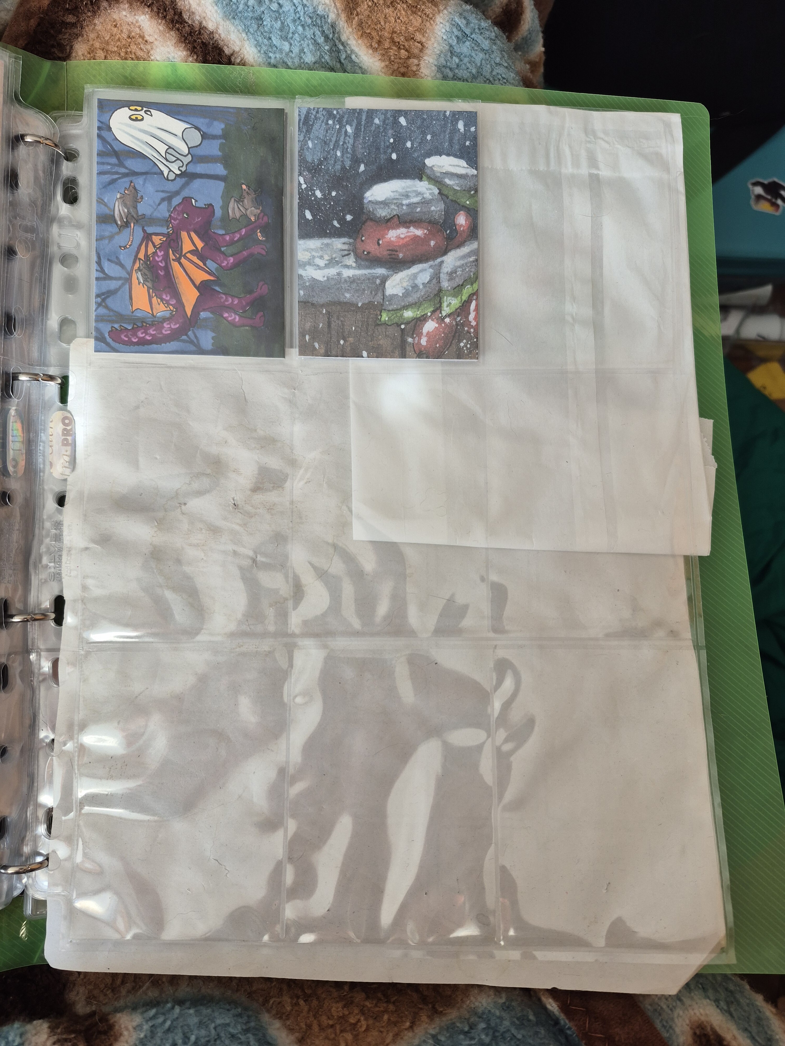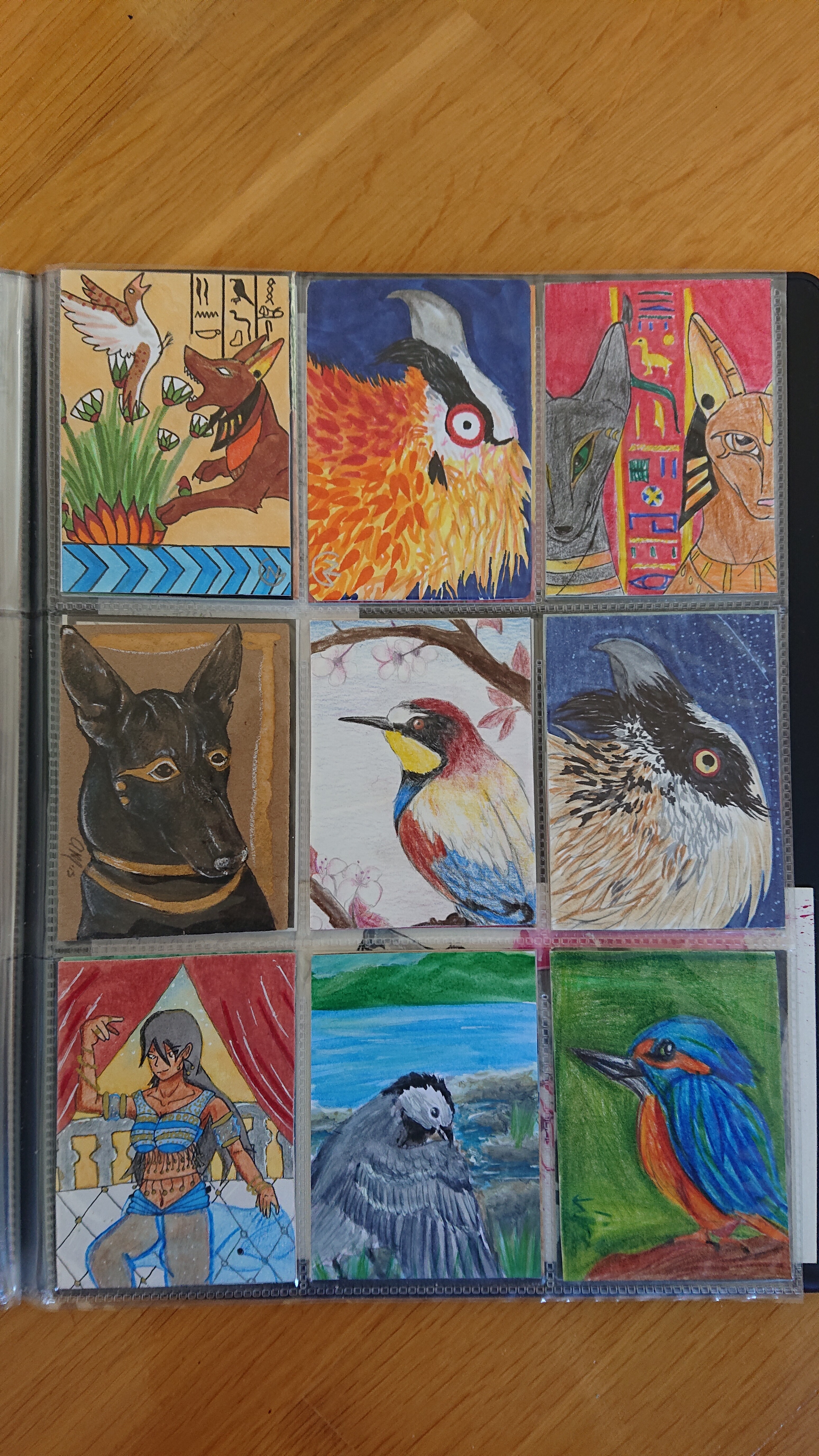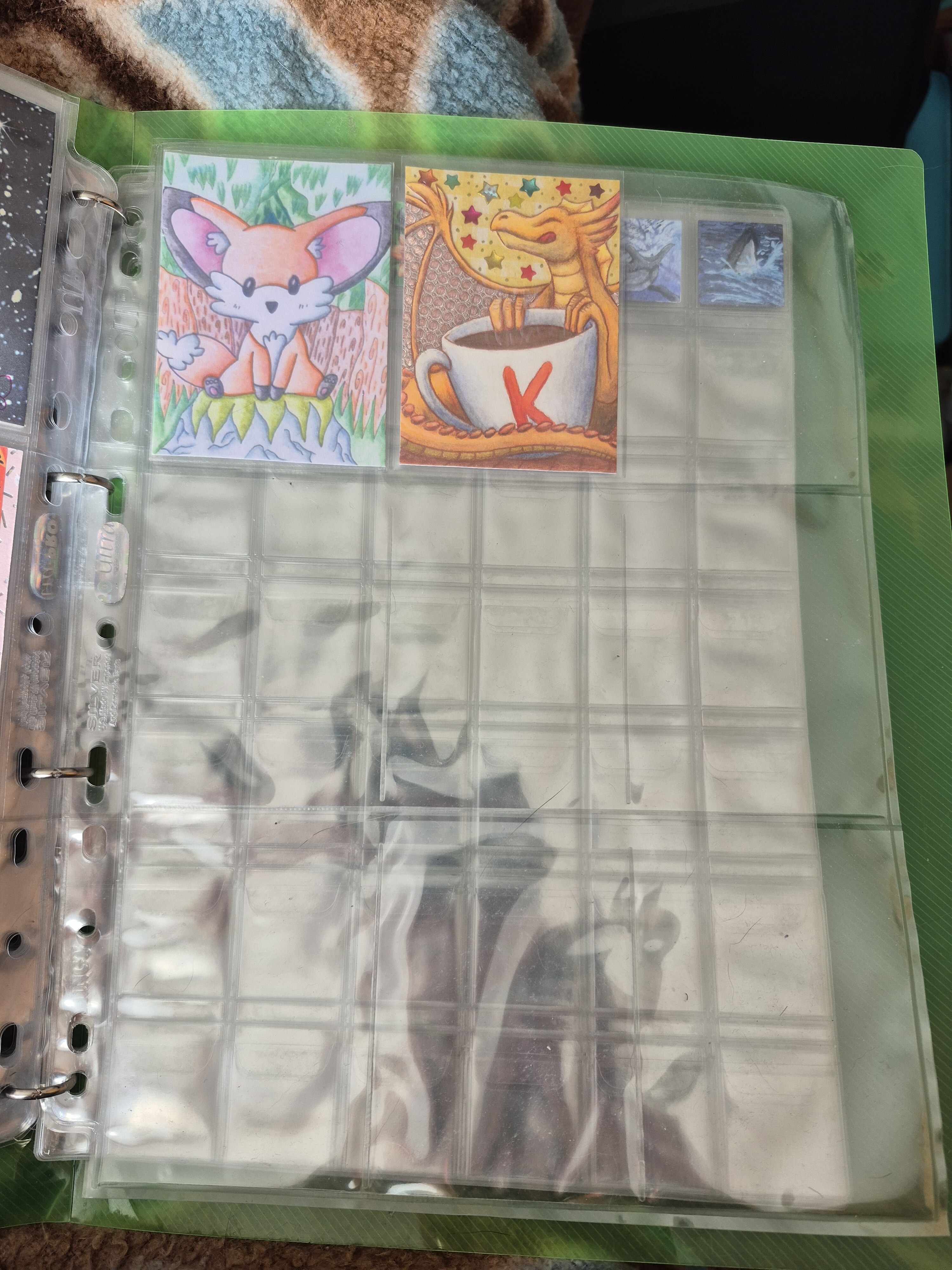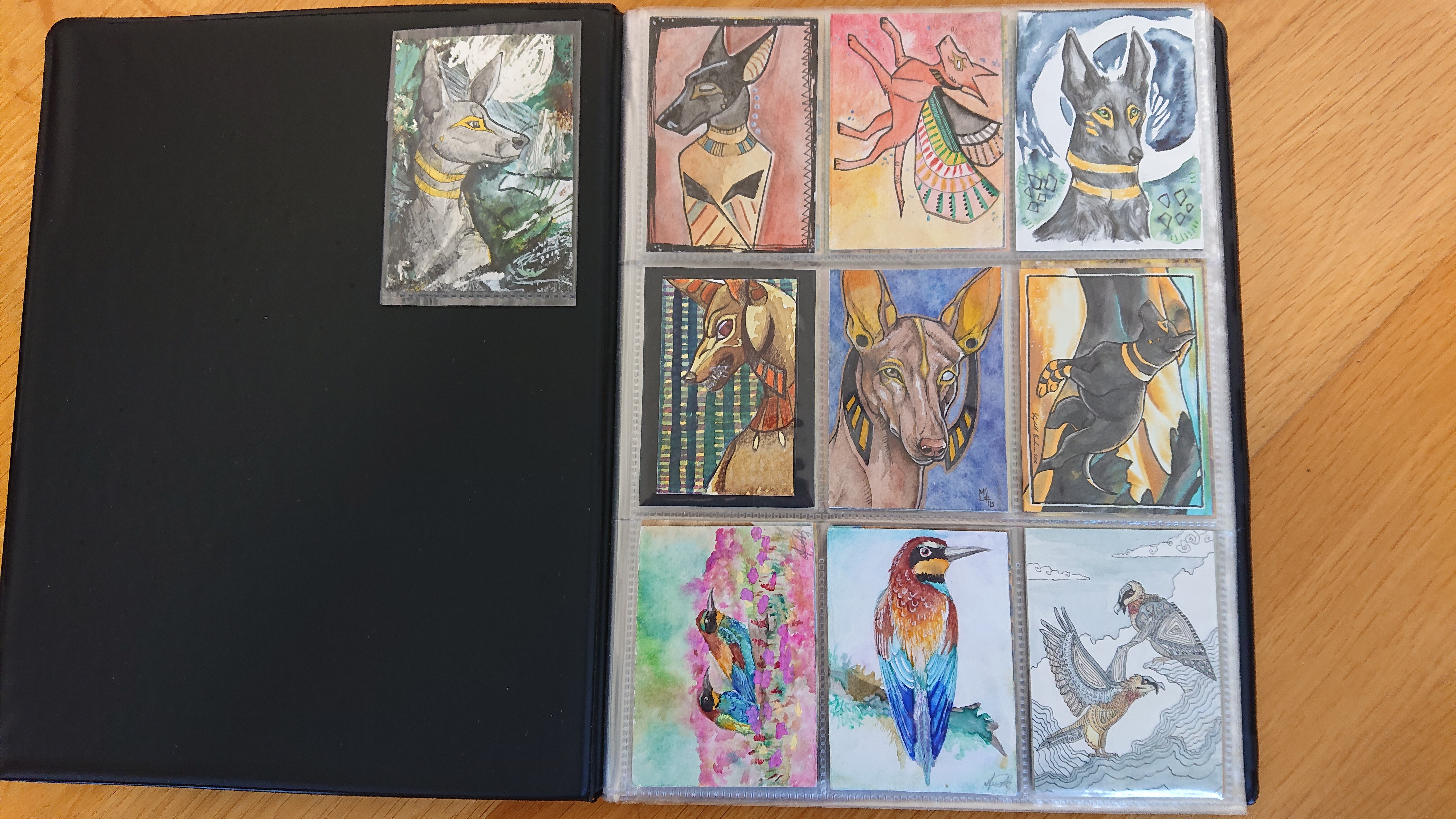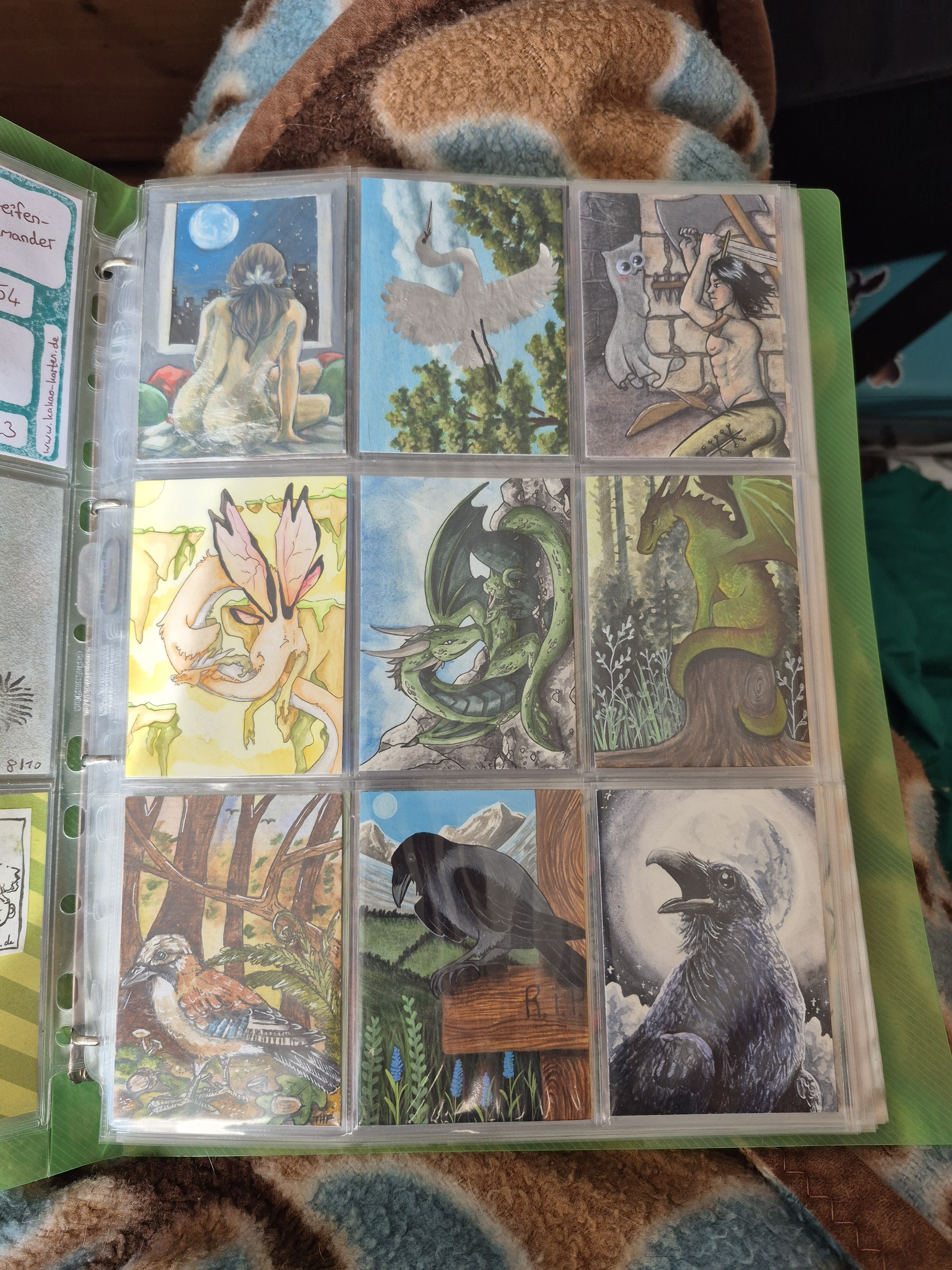 ) habe ich ausschließlich über DeviantArt getauscht und mir auch nur meine Hunde-OCs und Bienenfresser/Bartgeier gewünscht. Auf DeviantArt wurde kein Wert auf Rückseitengestaltung/Kartenverstärkung gelegt, weshalb diese alle eine weiße Rückseite haben und zT echt wabbelig sind. Als ich zu kk.de gewechselt hab, hat mich das erst total irritiert und genervt (“wieso die Rückseite gestalten, ist doch nur die Rückseite!”) - das hat sich aber schnell gewandelt, als ich sah, wie toll die Rückseiten im Album aussehen :) Auch wurden oft genug die Maße nicht eingehalten, weshalb ich zT Karten auf schwarzen Karton geklebt habe oder (wie auf dem Bild unten) eine kleine extra Folie basteln musste…