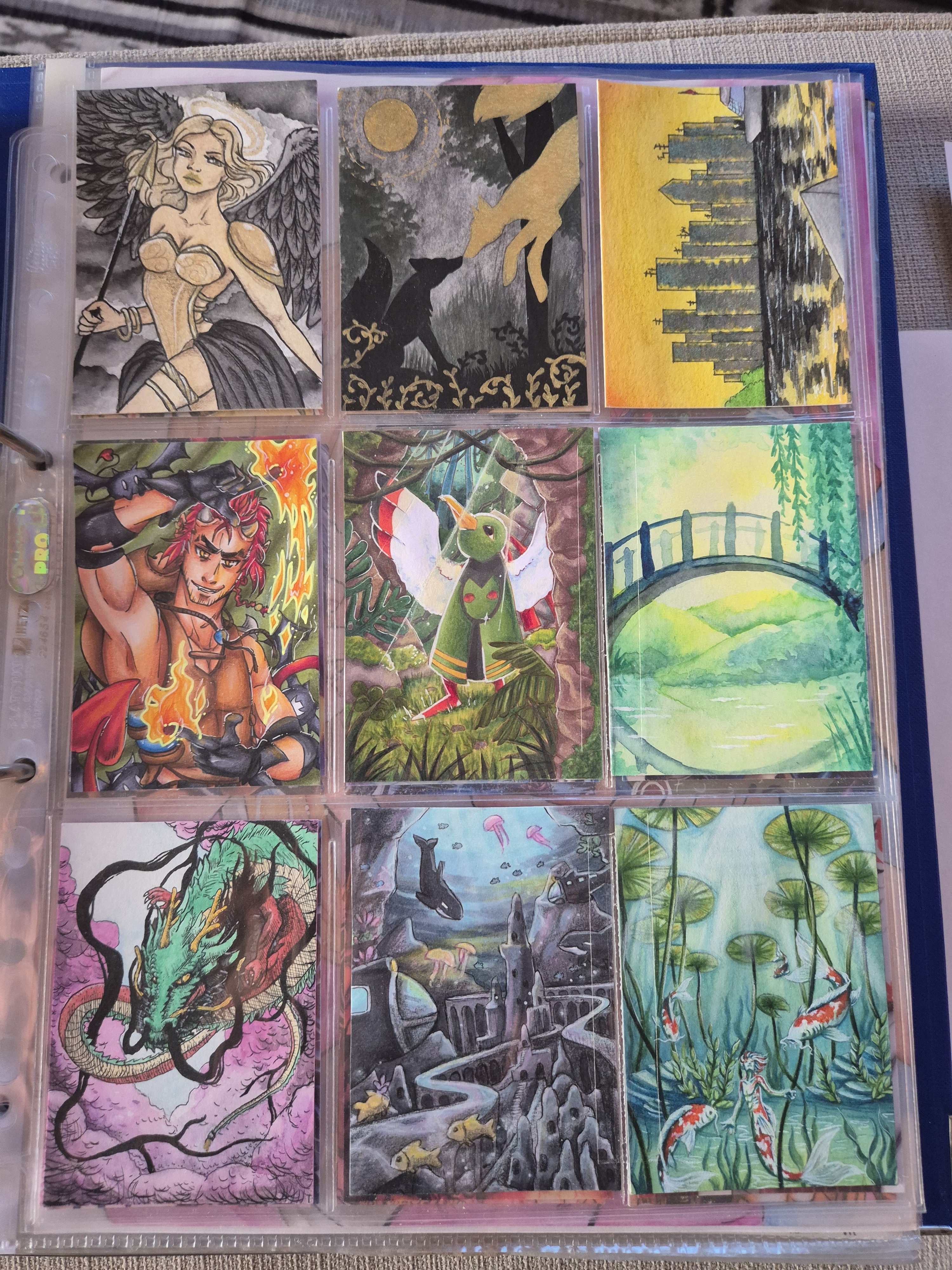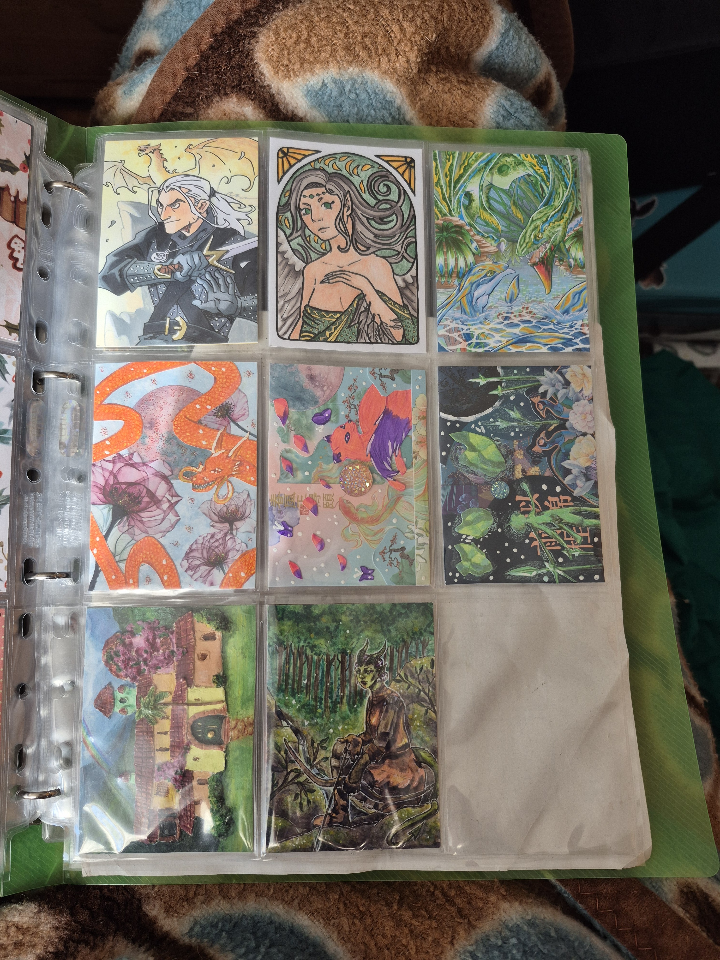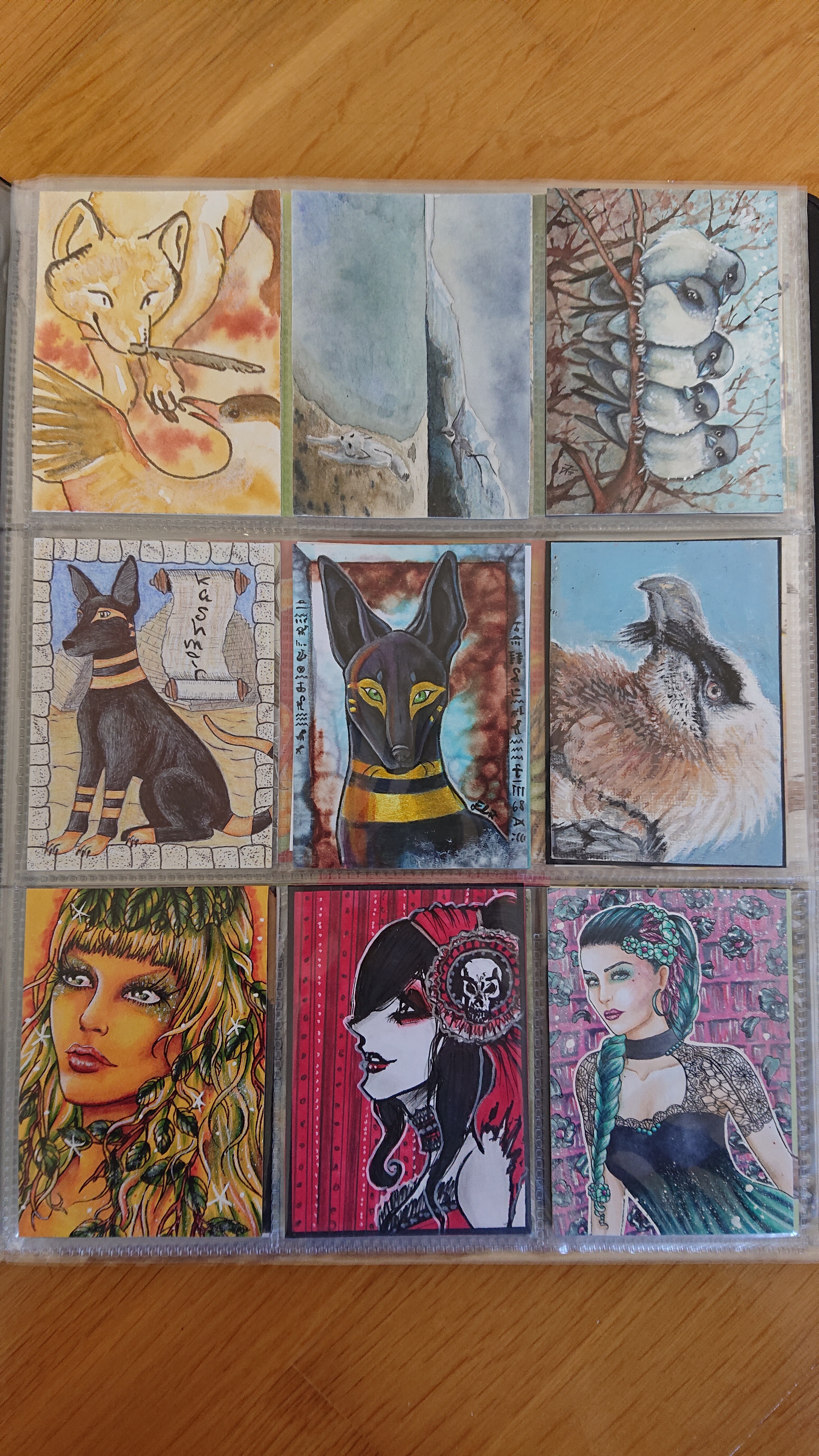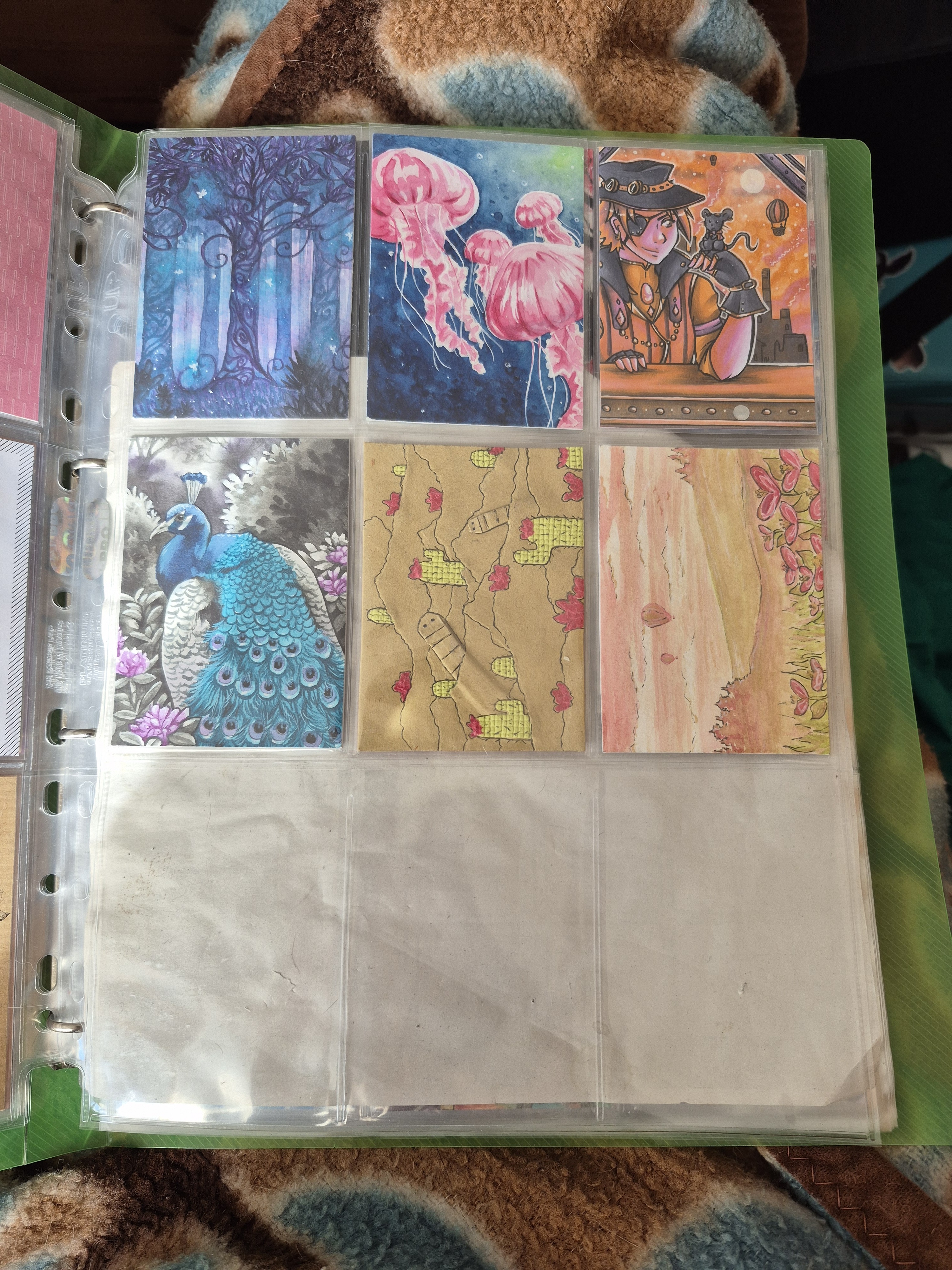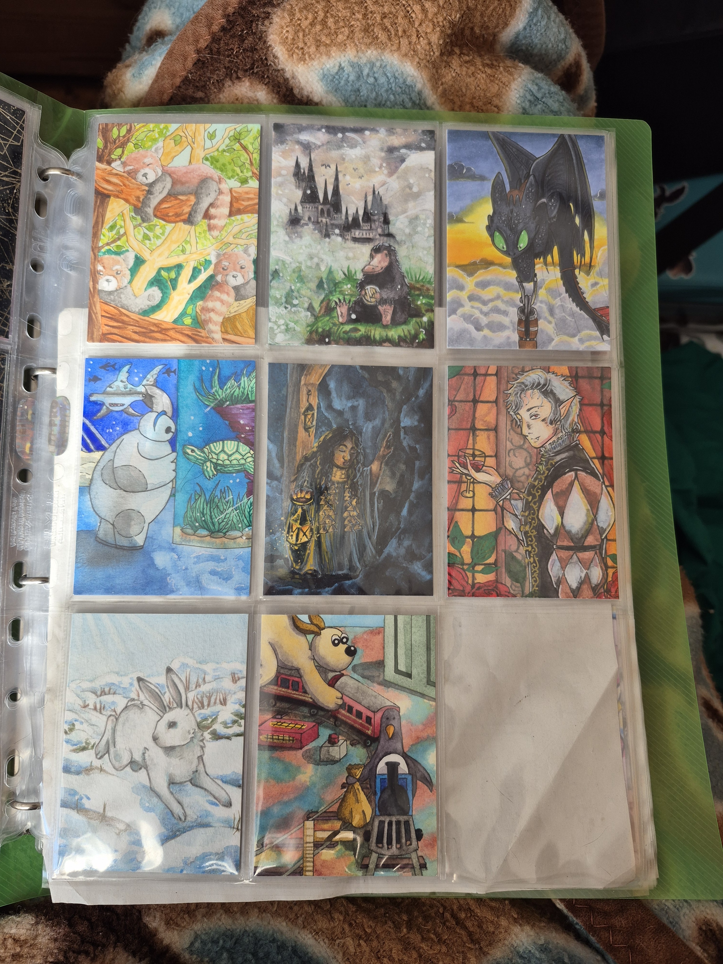 ) habe ich ausschließlich über DeviantArt getauscht und mir auch nur meine Hunde-OCs und Bienenfresser/Bartgeier gewünscht. Auf DeviantArt wurde kein Wert auf Rückseitengestaltung/Kartenverstärkung gelegt, weshalb diese alle eine weiße Rückseite haben und zT echt wabbelig sind. Als ich zu kk.de gewechselt hab, hat mich das erst total irritiert und genervt (“wieso die Rückseite gestalten, ist doch nur die Rückseite!”) - das hat sich aber schnell gewandelt, als ich sah, wie toll die Rückseiten im Album aussehen :) Auch wurden oft genug die Maße nicht eingehalten, weshalb ich zT Karten auf schwarzen Karton geklebt habe oder (wie auf dem Bild unten) eine kleine extra Folie basteln musste…