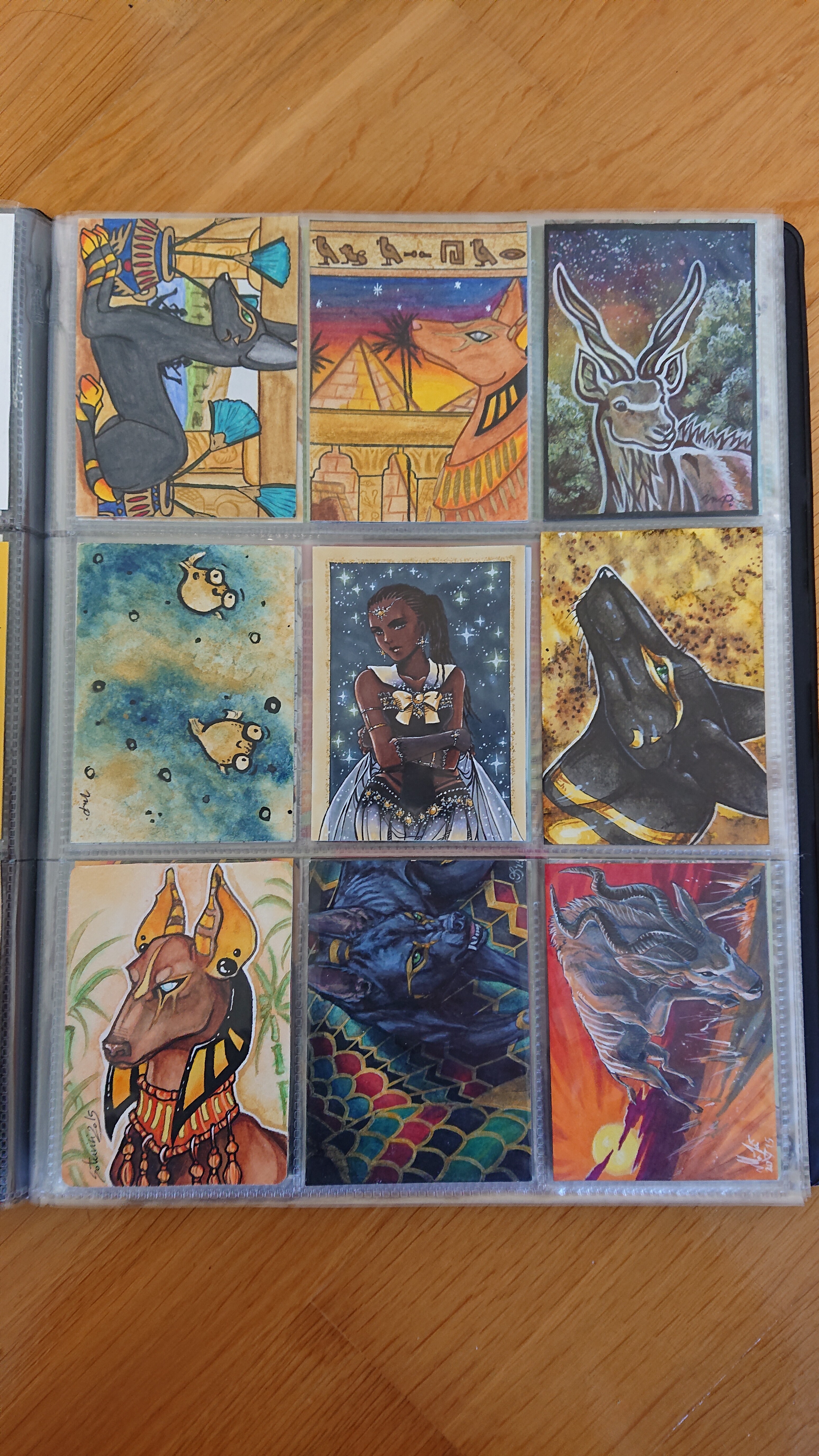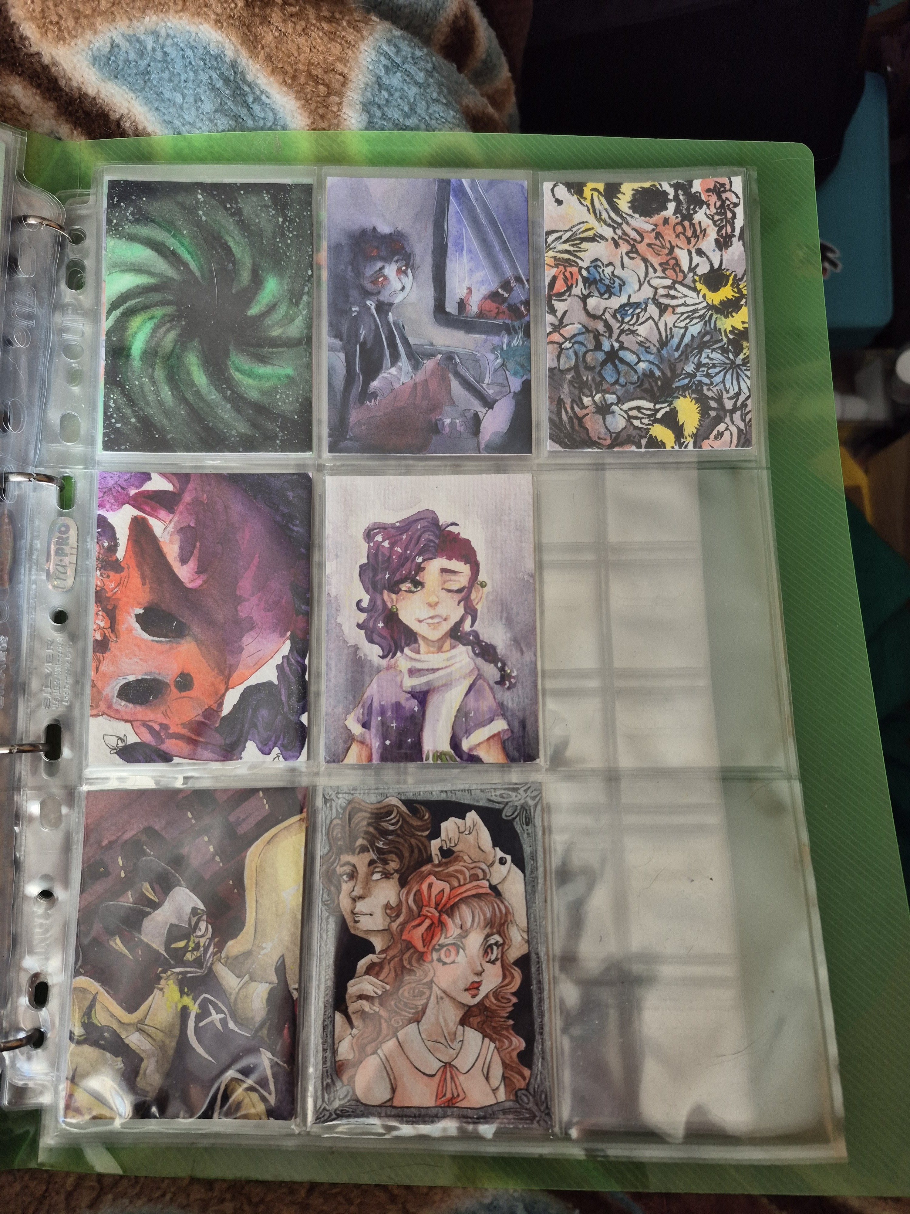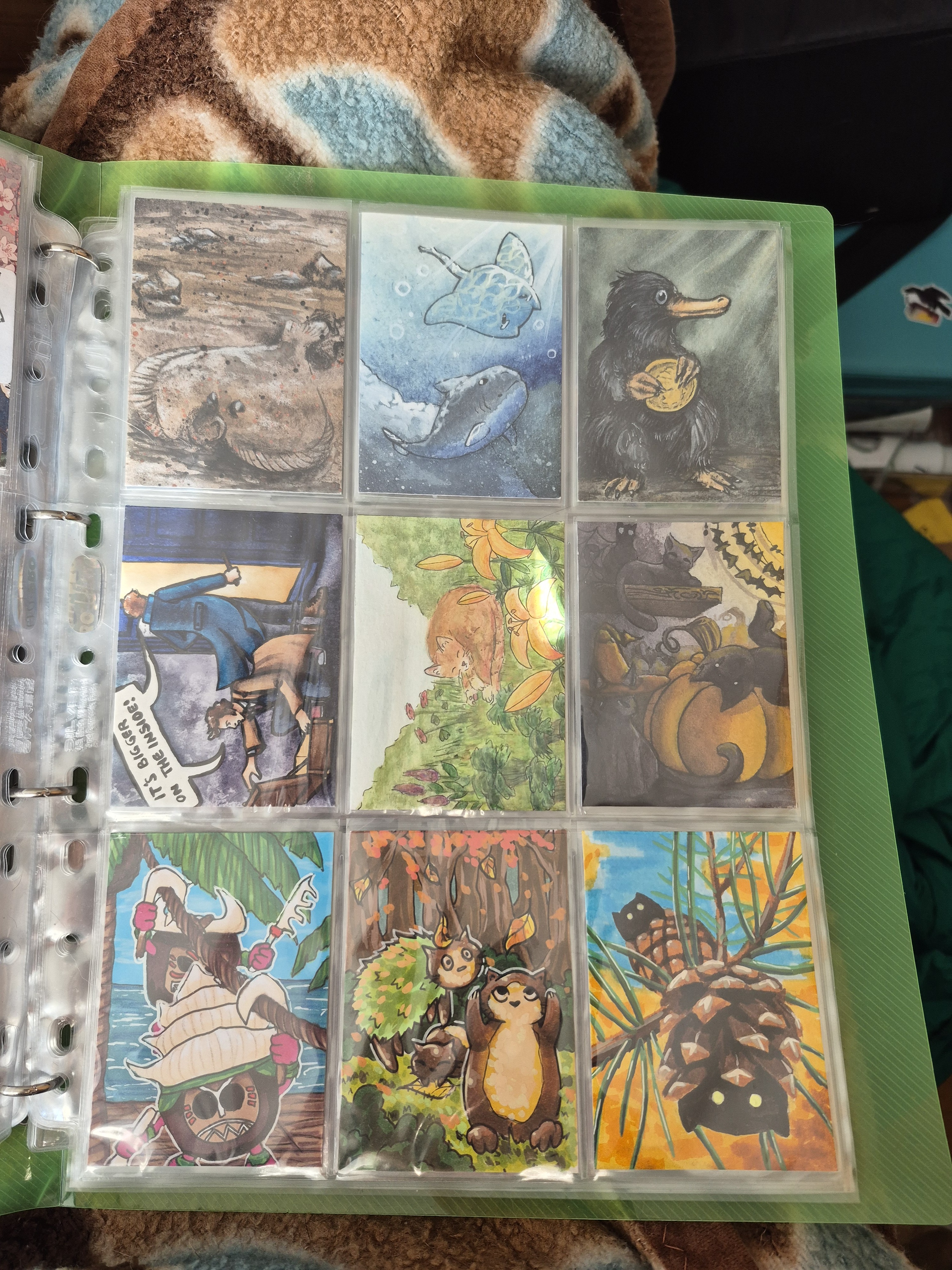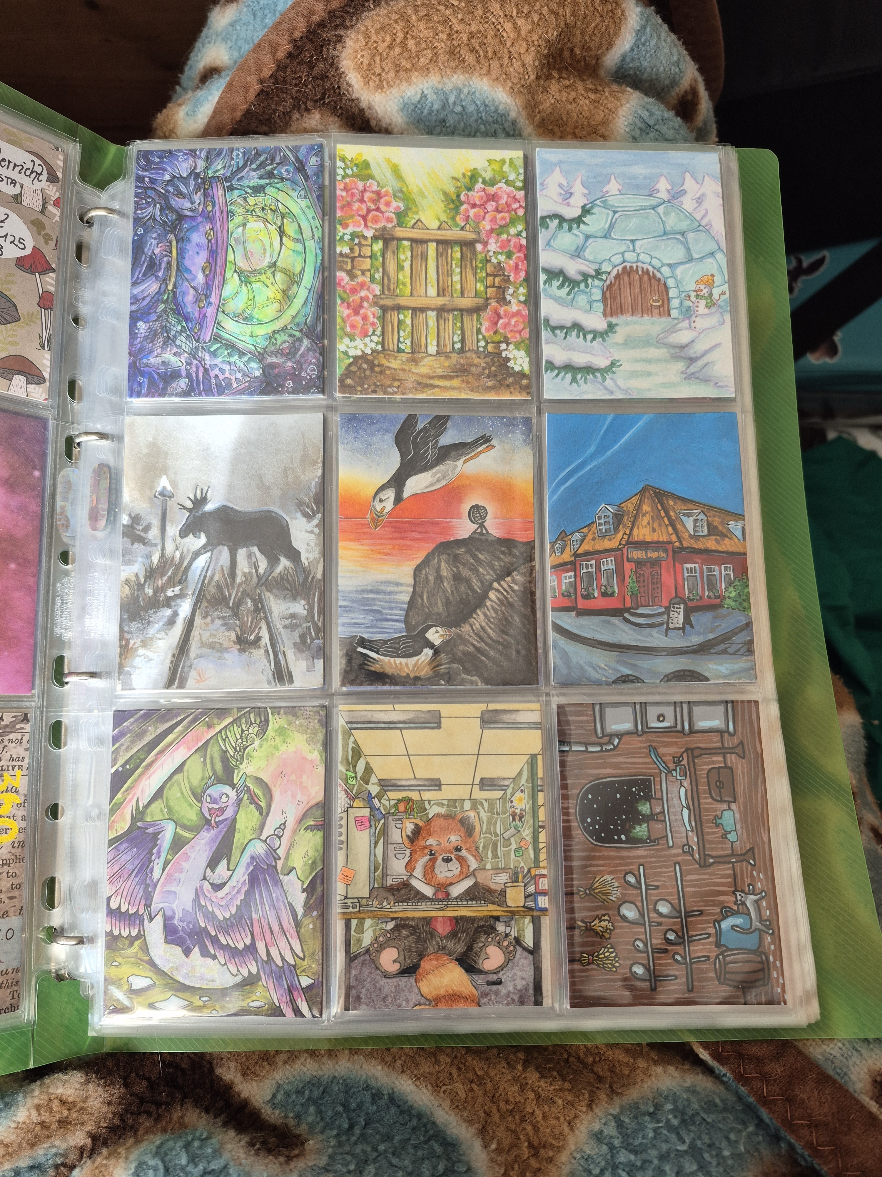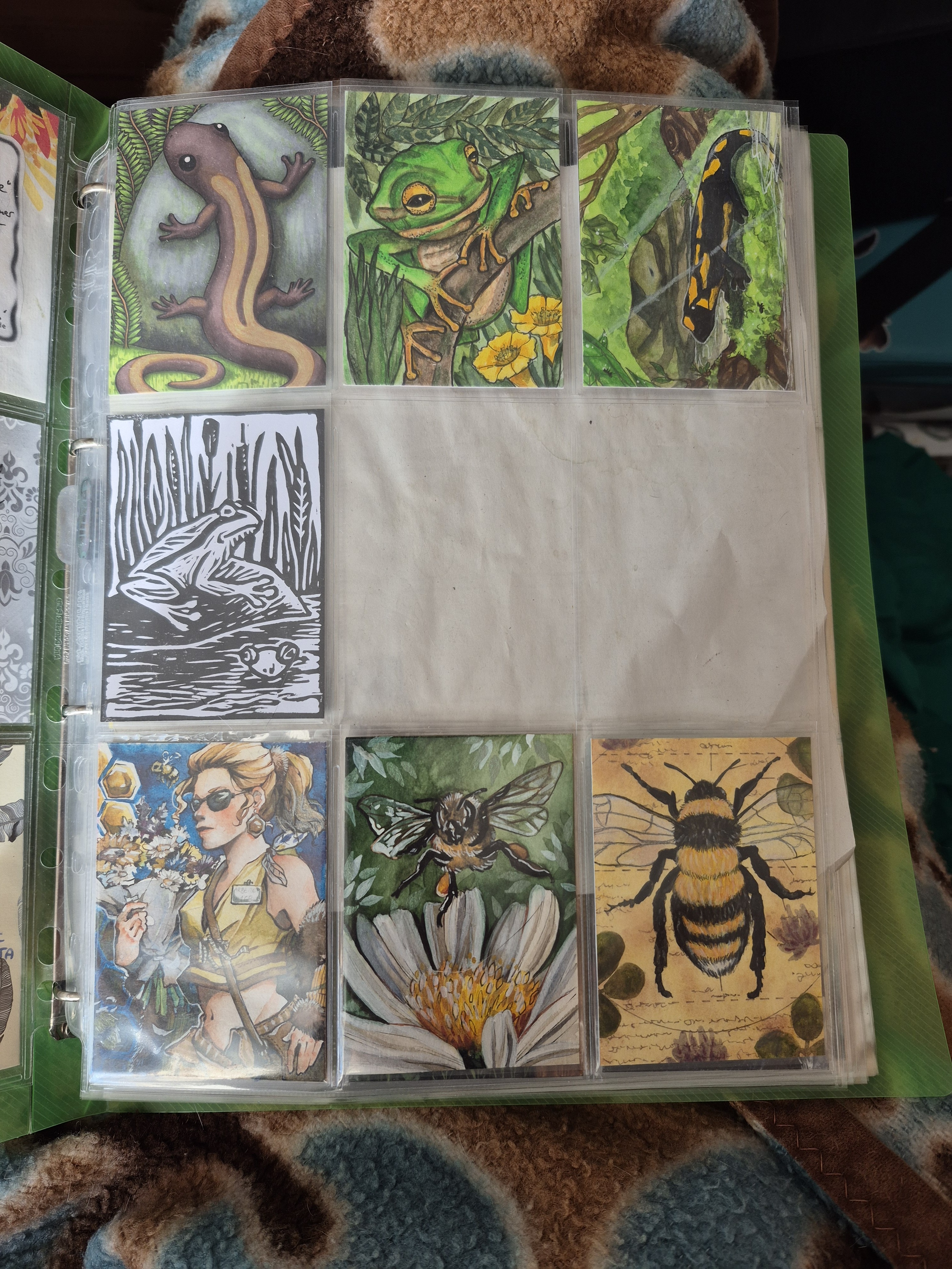 ) habe ich ausschließlich über DeviantArt getauscht und mir auch nur meine Hunde-OCs und Bienenfresser/Bartgeier gewünscht. Auf DeviantArt wurde kein Wert auf Rückseitengestaltung/Kartenverstärkung gelegt, weshalb diese alle eine weiße Rückseite haben und zT echt wabbelig sind. Als ich zu kk.de gewechselt hab, hat mich das erst total irritiert und genervt (“wieso die Rückseite gestalten, ist doch nur die Rückseite!”) - das hat sich aber schnell gewandelt, als ich sah, wie toll die Rückseiten im Album aussehen :) Auch wurden oft genug die Maße nicht eingehalten, weshalb ich zT Karten auf schwarzen Karton geklebt habe oder (wie auf dem Bild unten) eine kleine extra Folie basteln musste…