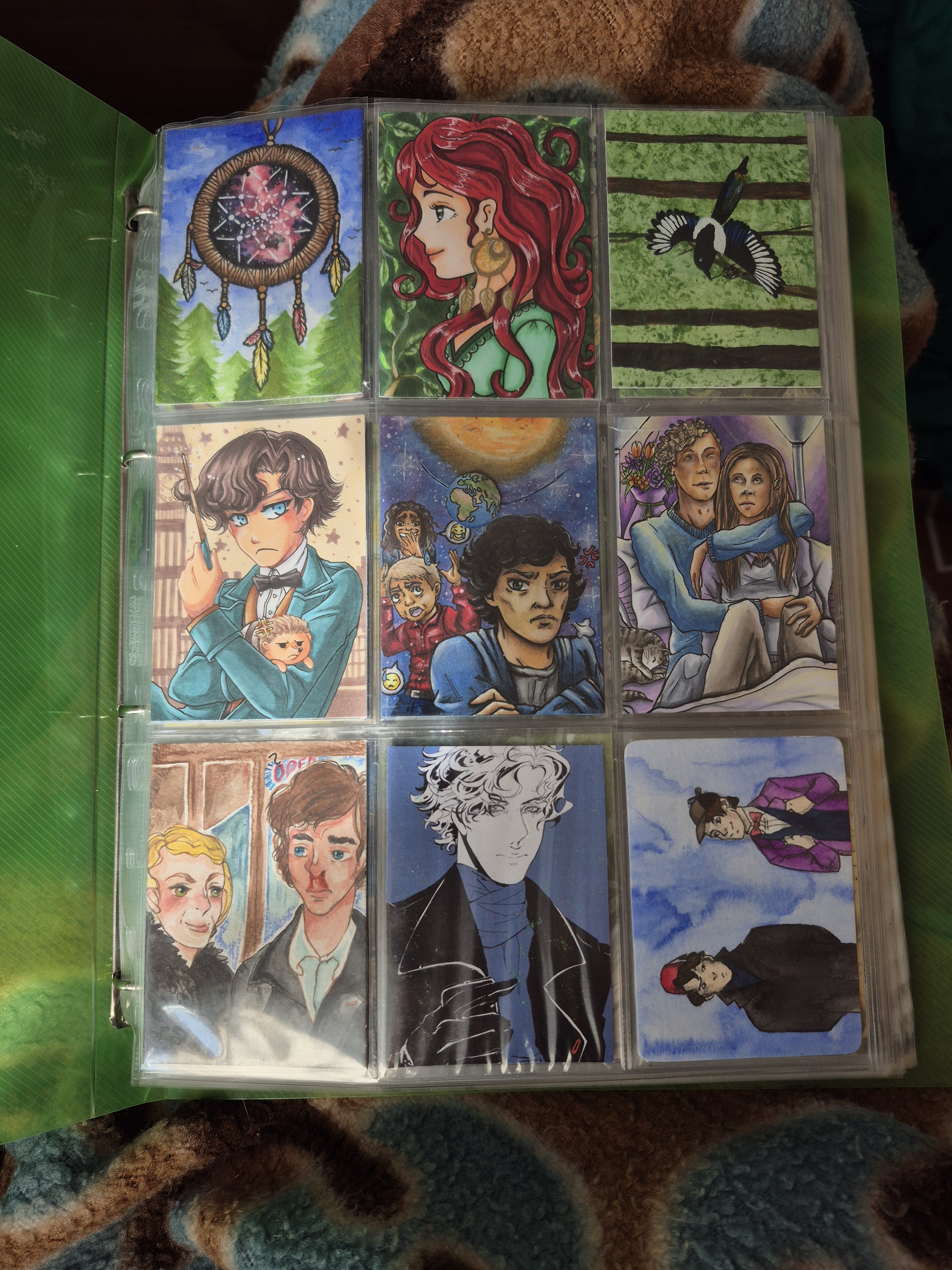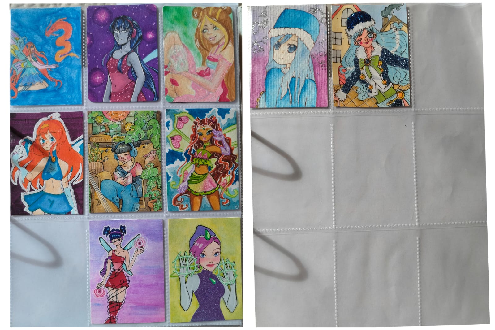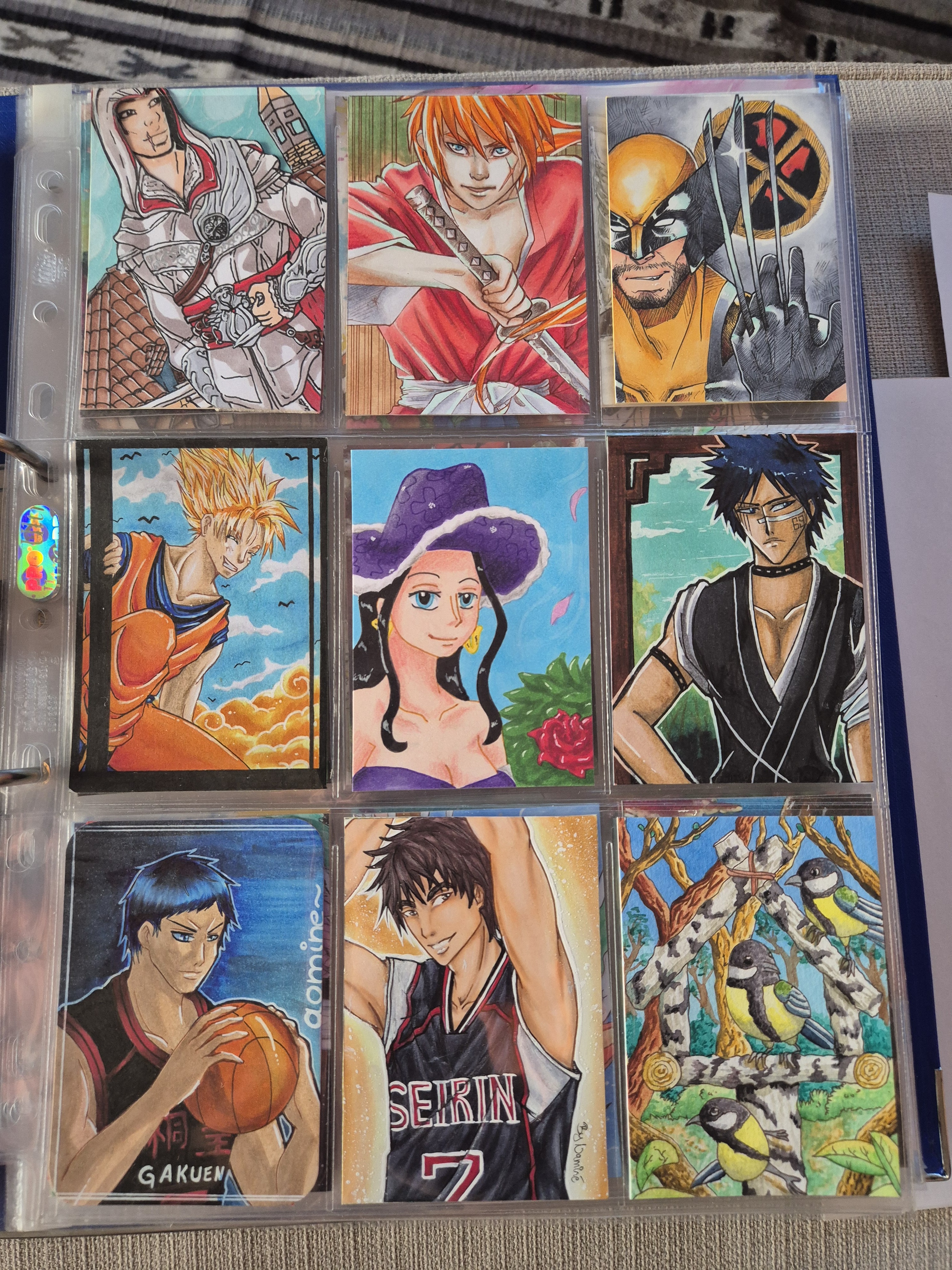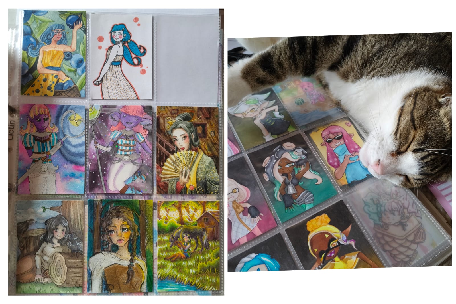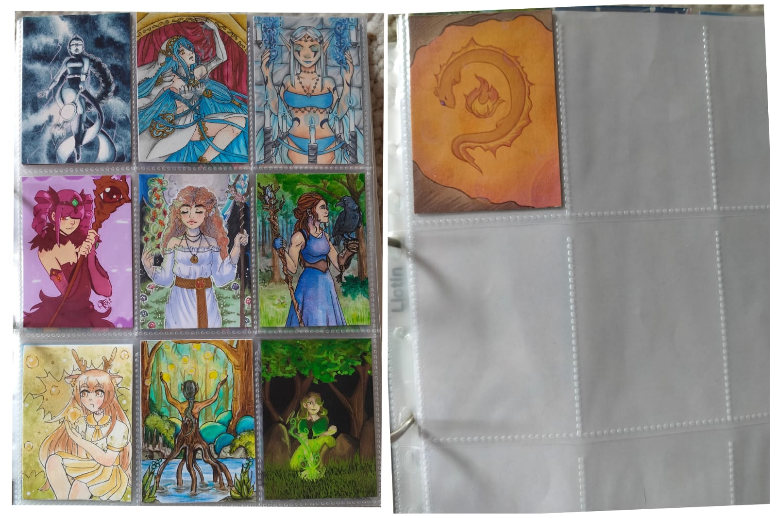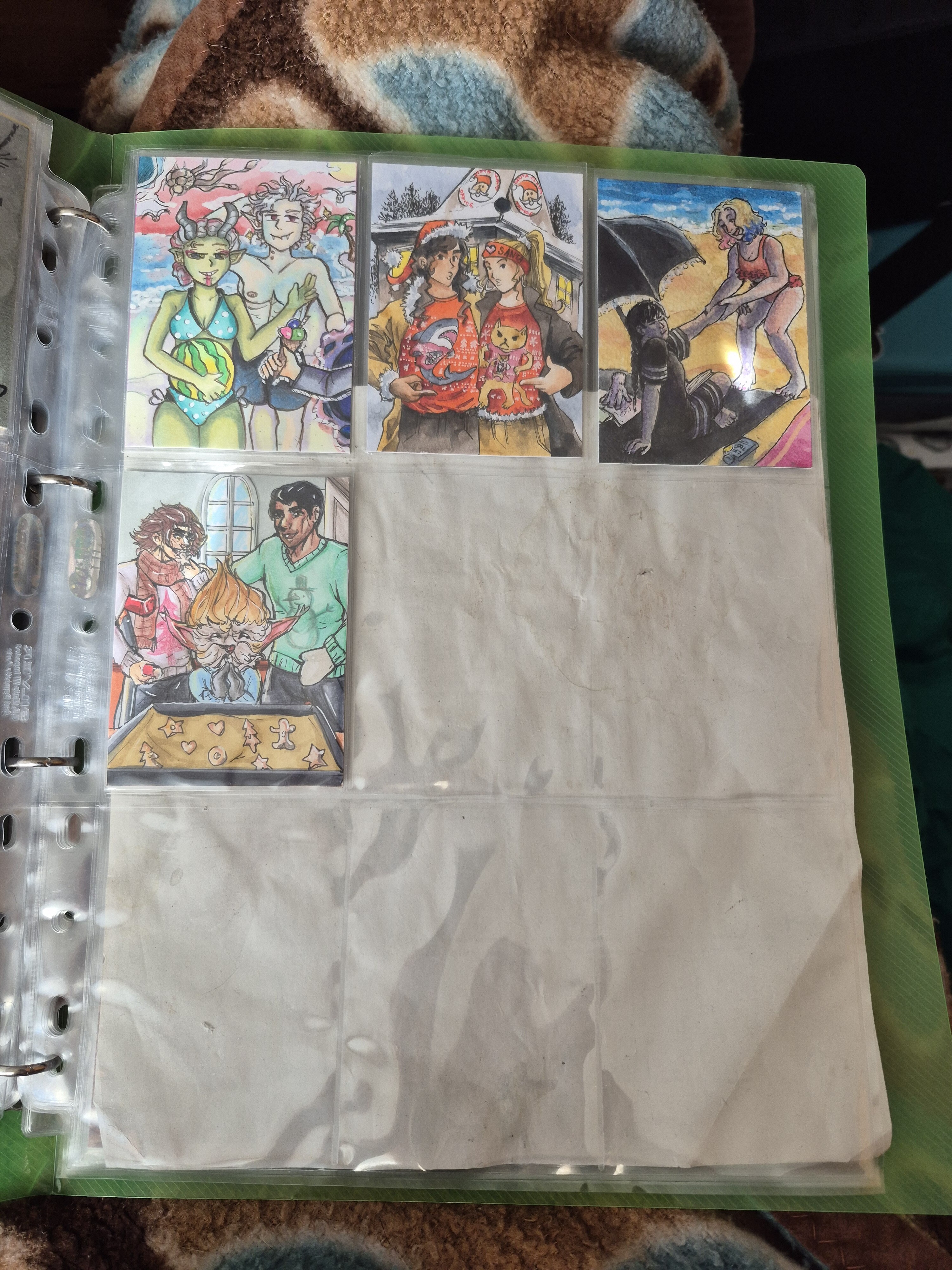) habe ich ausschließlich über DeviantArt getauscht und mir auch nur meine Hunde-OCs und Bienenfresser/Bartgeier gewünscht. Auf DeviantArt wurde kein Wert auf Rückseitengestaltung/Kartenverstärkung gelegt, weshalb diese alle eine weiße Rückseite haben und zT echt wabbelig sind. Als ich zu kk.de gewechselt hab, hat mich das erst total irritiert und genervt (“wieso die Rückseite gestalten, ist doch nur die Rückseite!”) - das hat sich aber schnell gewandelt, als ich sah, wie toll die Rückseiten im Album aussehen :) Auch wurden oft genug die Maße nicht eingehalten, weshalb ich zT Karten auf schwarzen Karton geklebt habe oder (wie auf dem Bild unten) eine kleine extra Folie basteln musste…