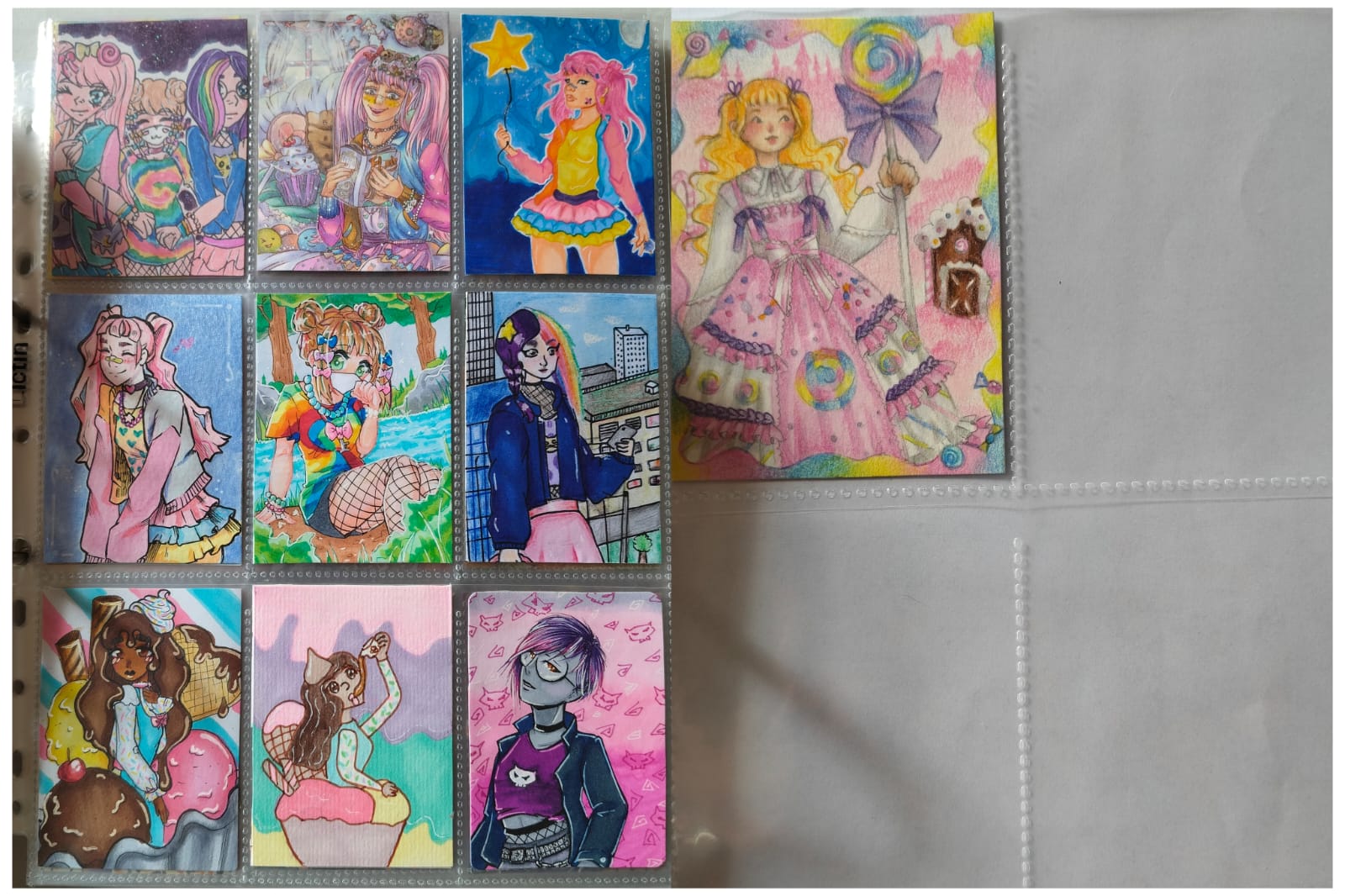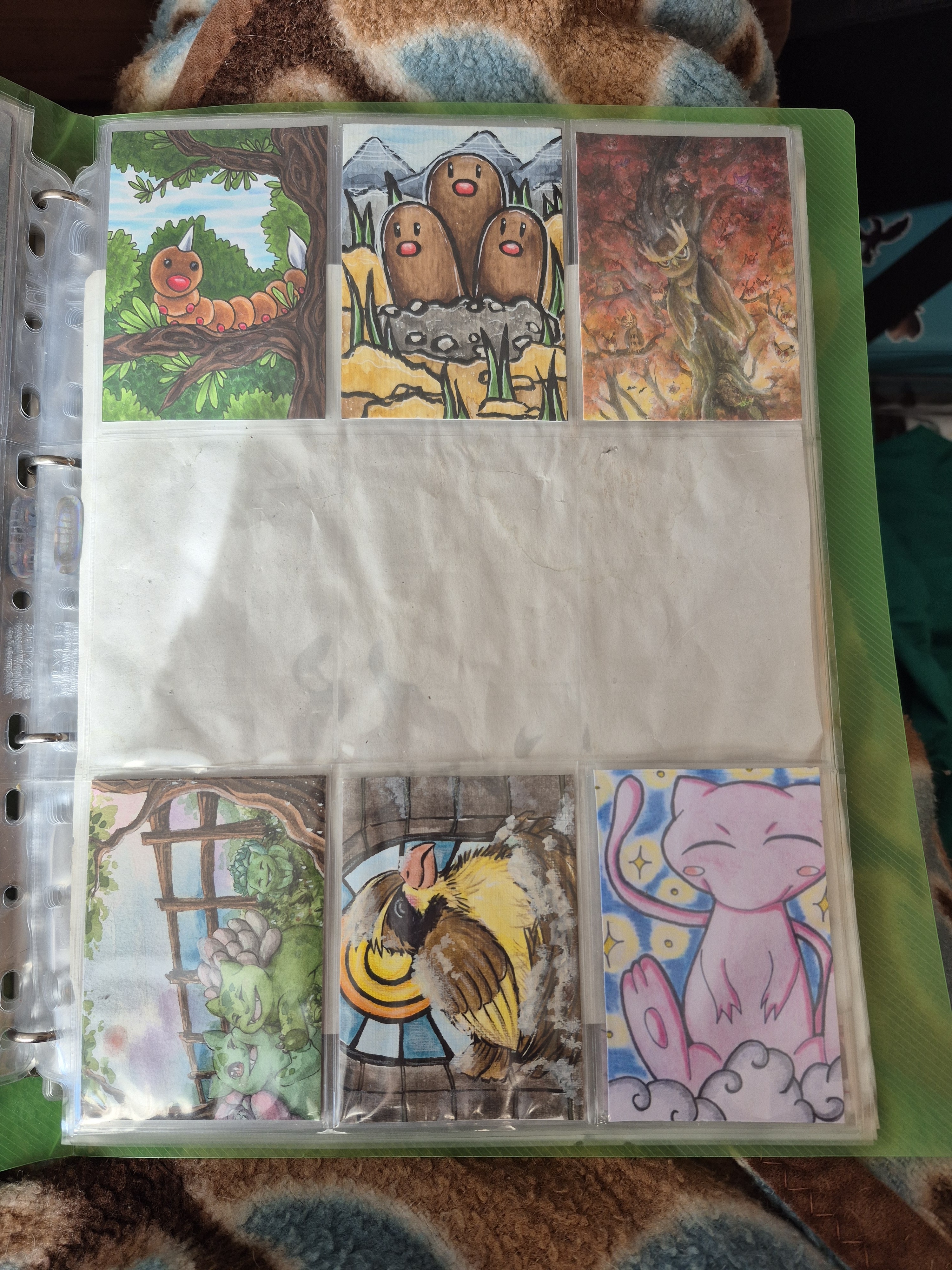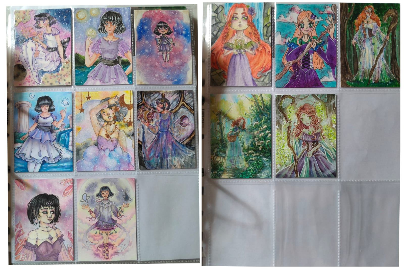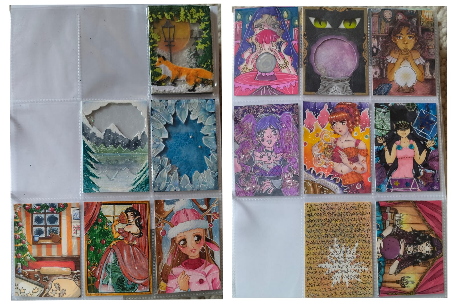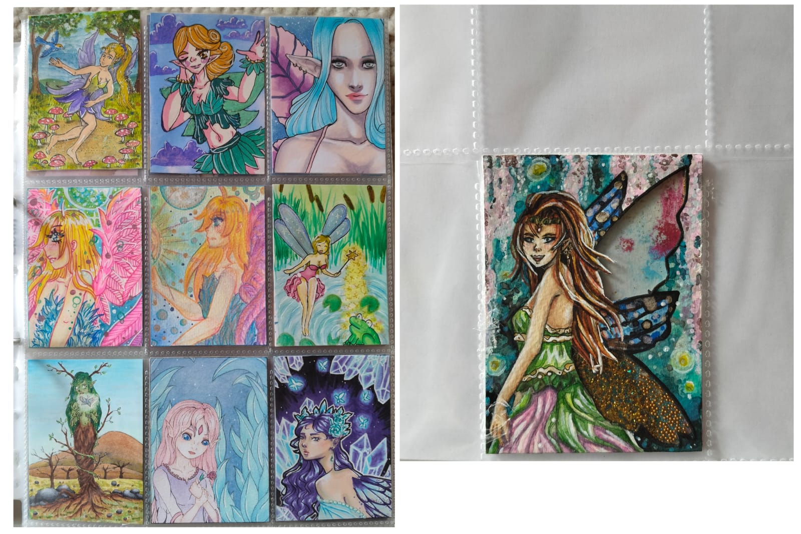 ) habe ich ausschließlich über DeviantArt getauscht und mir auch nur meine Hunde-OCs und Bienenfresser/Bartgeier gewünscht. Auf DeviantArt wurde kein Wert auf Rückseitengestaltung/Kartenverstärkung gelegt, weshalb diese alle eine weiße Rückseite haben und zT echt wabbelig sind. Als ich zu kk.de gewechselt hab, hat mich das erst total irritiert und genervt (“wieso die Rückseite gestalten, ist doch nur die Rückseite!”) - das hat sich aber schnell gewandelt, als ich sah, wie toll die Rückseiten im Album aussehen :) Auch wurden oft genug die Maße nicht eingehalten, weshalb ich zT Karten auf schwarzen Karton geklebt habe oder (wie auf dem Bild unten) eine kleine extra Folie basteln musste…