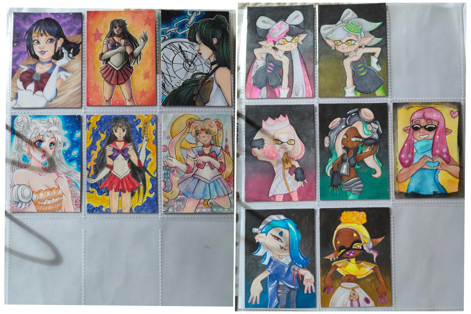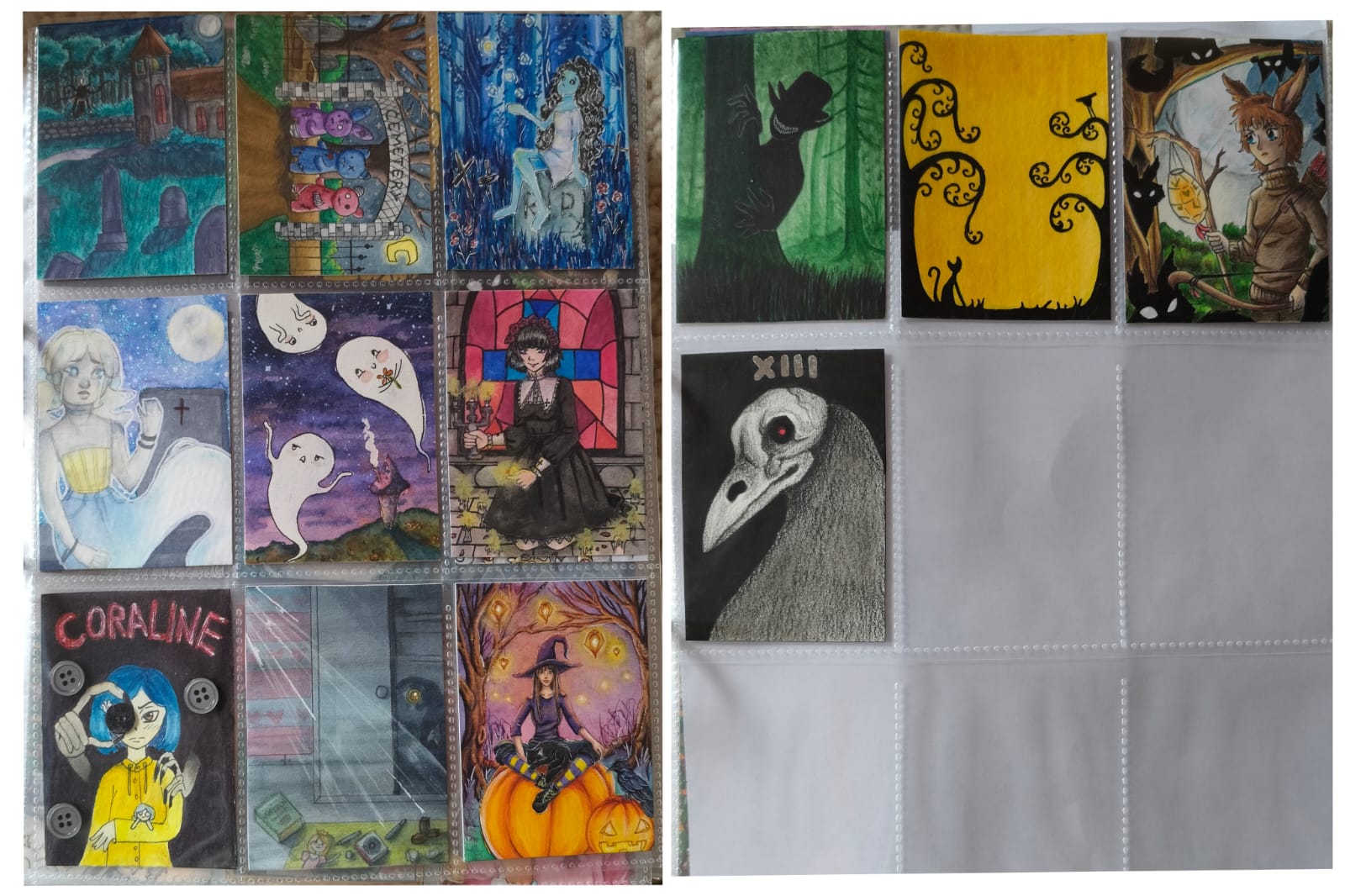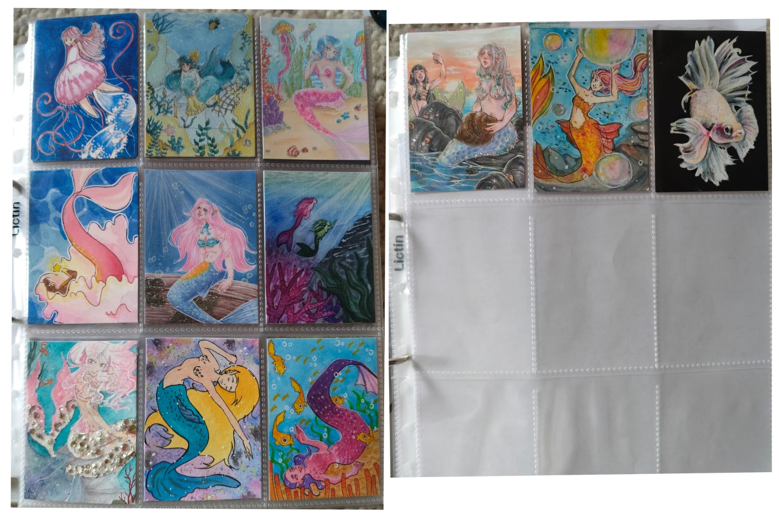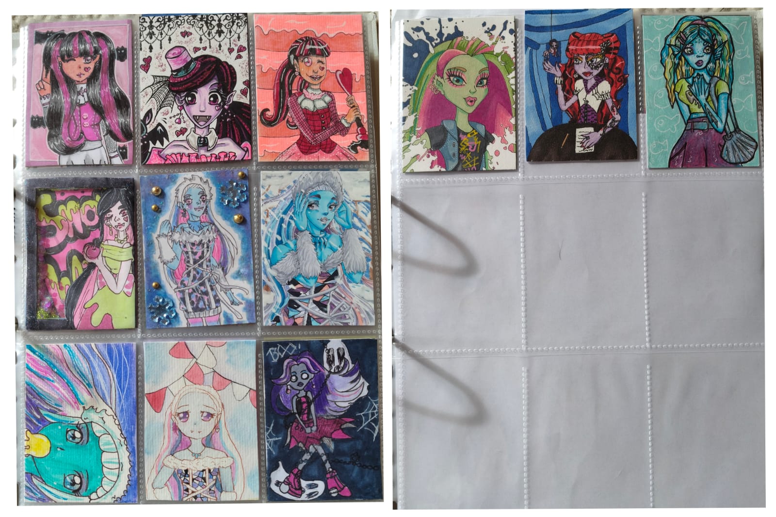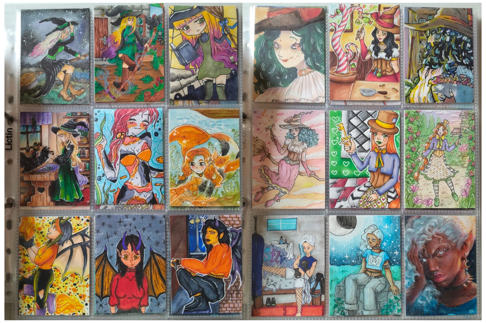 ) habe ich ausschließlich über DeviantArt getauscht und mir auch nur meine Hunde-OCs und Bienenfresser/Bartgeier gewünscht. Auf DeviantArt wurde kein Wert auf Rückseitengestaltung/Kartenverstärkung gelegt, weshalb diese alle eine weiße Rückseite haben und zT echt wabbelig sind. Als ich zu kk.de gewechselt hab, hat mich das erst total irritiert und genervt (“wieso die Rückseite gestalten, ist doch nur die Rückseite!”) - das hat sich aber schnell gewandelt, als ich sah, wie toll die Rückseiten im Album aussehen :) Auch wurden oft genug die Maße nicht eingehalten, weshalb ich zT Karten auf schwarzen Karton geklebt habe oder (wie auf dem Bild unten) eine kleine extra Folie basteln musste…