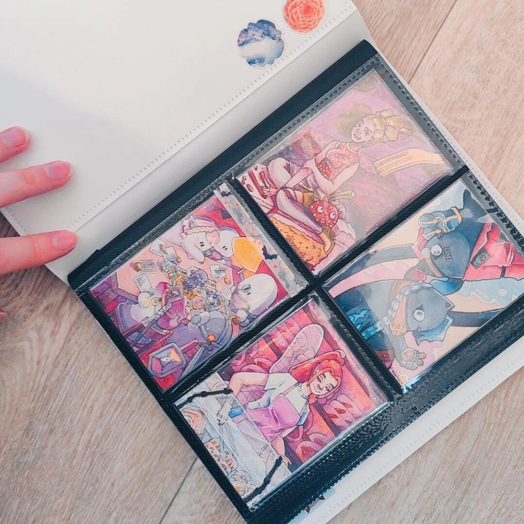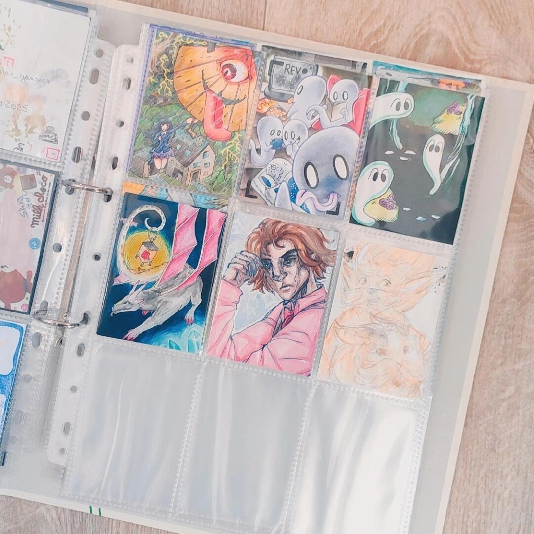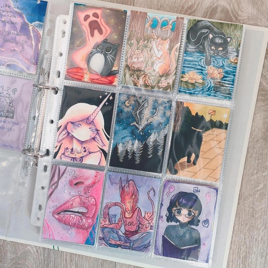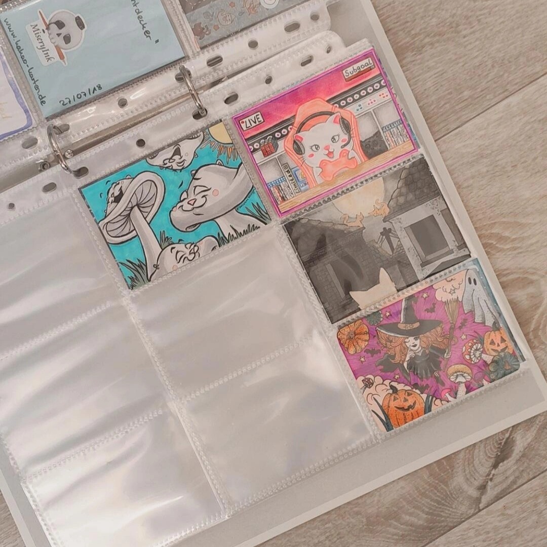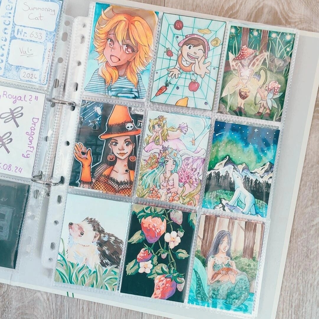 Sonst hab ich noch so einen kleinen Ordner, wo ich meine eigenen Karten verstaue und sie auf ihre neuen Besitzer wartenXD Hier ordne ich eig auch nach dem Zeitpunkt wann ich sie gemacht habe und direckt in Hülle und wenn sie reserviert sind mag ich sie mit Washi markieren indem ich sie zuklebe soweit ich es nicht vergesse. Und ich mag diesen Ordner mit Stickern zu bekleben, vorallem wenn sie von dem Artist kommen, mit dem ich getauscht hab:)