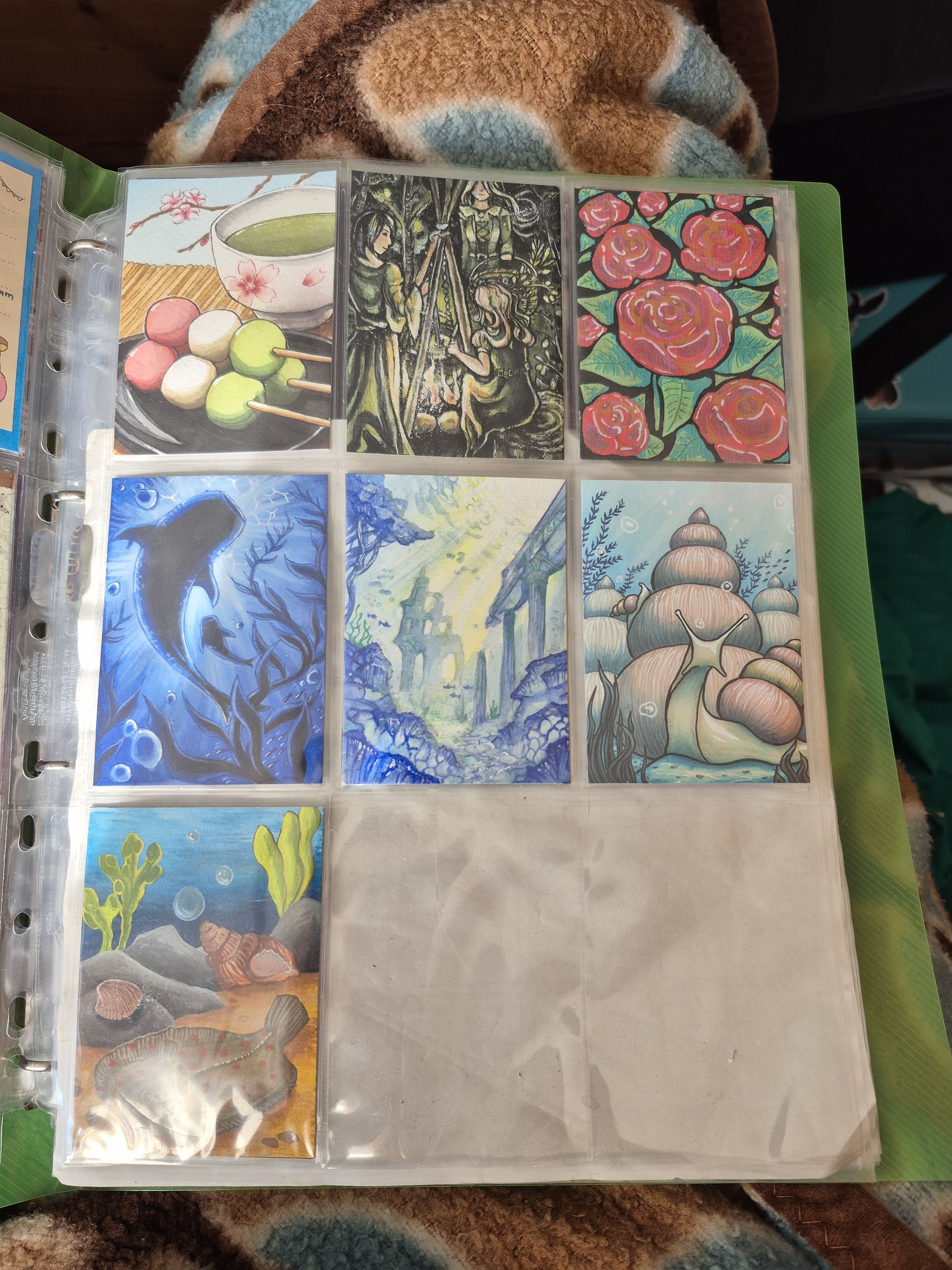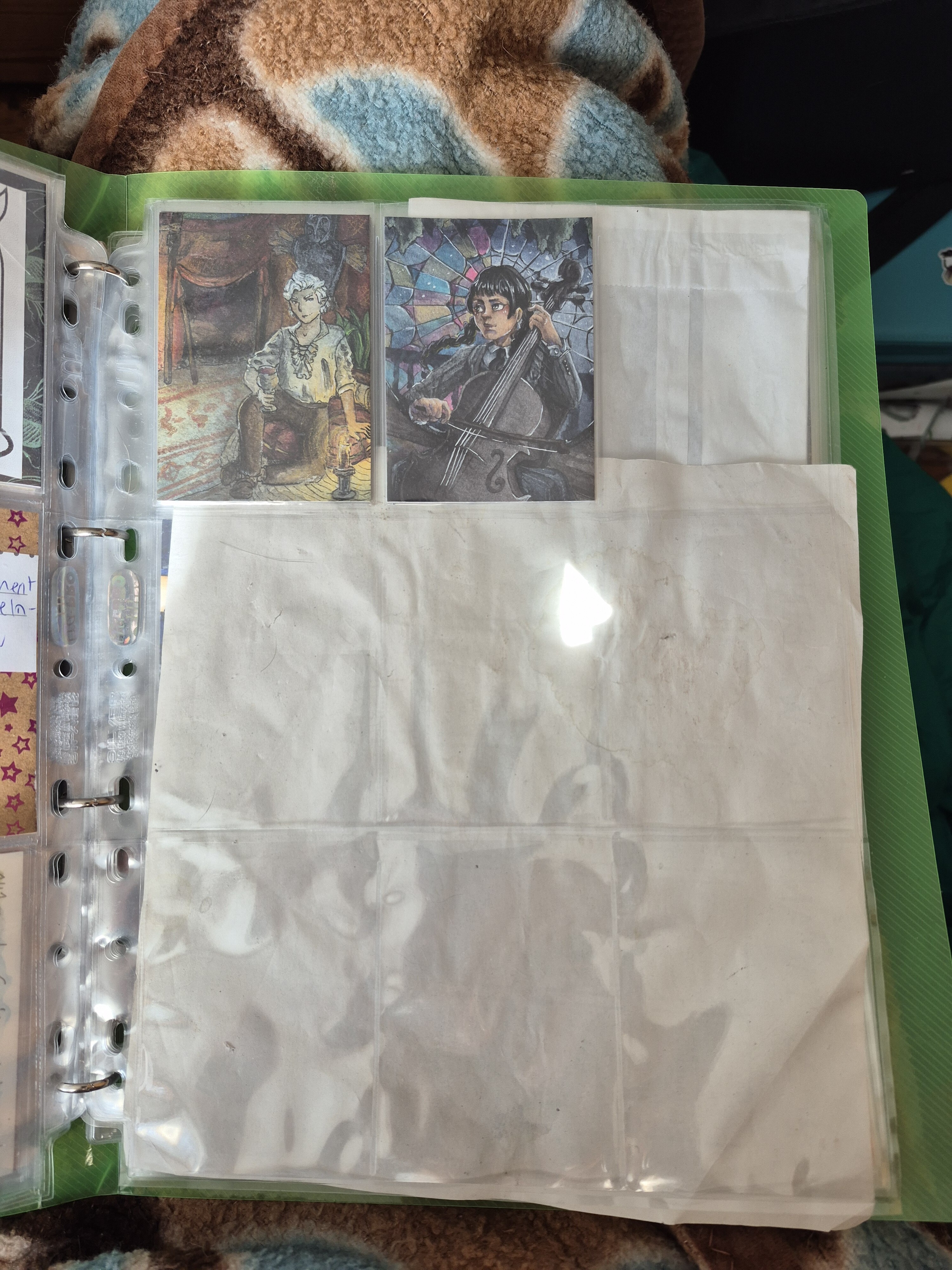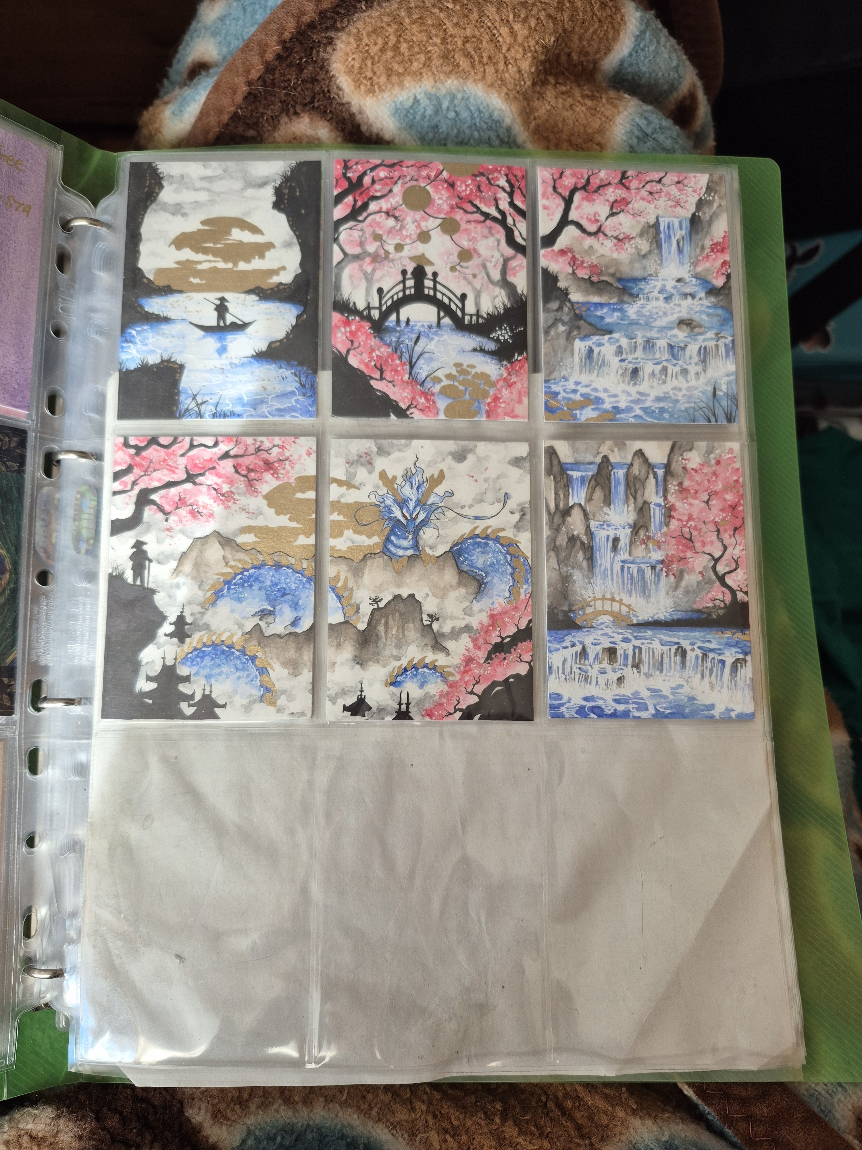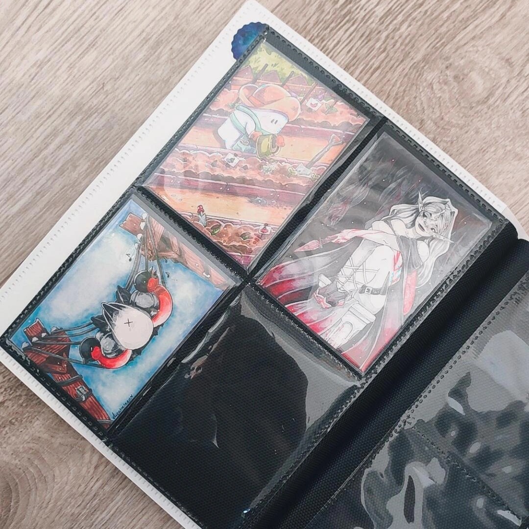 Sonst hab ich noch so einen kleinen Ordner, wo ich meine eigenen Karten verstaue und sie auf ihre neuen Besitzer wartenXD Hier ordne ich eig auch nach dem Zeitpunkt wann ich sie gemacht habe und direckt in Hülle und wenn sie reserviert sind mag ich sie mit Washi markieren indem ich sie zuklebe soweit ich es nicht vergesse. Und ich mag diesen Ordner mit Stickern zu bekleben, vorallem wenn sie von dem Artist kommen, mit dem ich getauscht hab:)