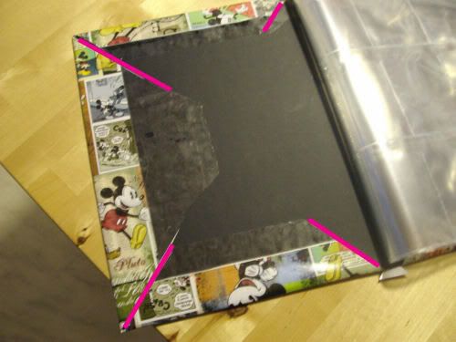 Zuerst nehmt ihr euch aber nocheinmal Tesastreifen zur Hand und klebt diese auf die rosa markierten Stellen, bis knapp an die Mappenränder.