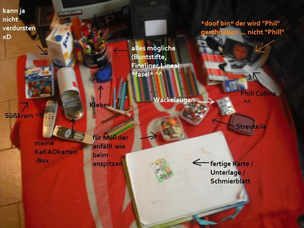 Ich hab vor zwei Tagen aufgeräumt, sobald der Tisch wieder seinen normal-chaos-amokzeichnen-zustand erreicht hat, mache ich noch ein zwei Bilder für euch - ich bin auch eine Chaosqueen und ich gebe es zu! xD