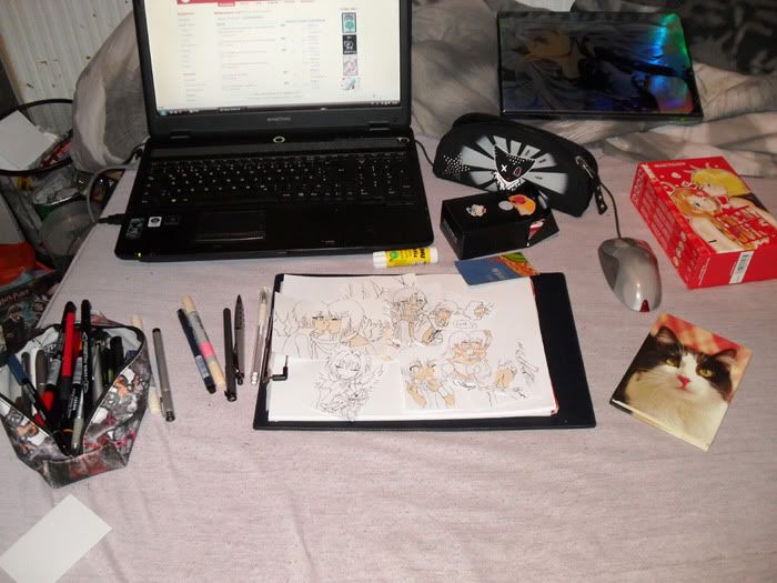 Zu sehn sind meine Kakao Mappe oben rechts, mein kakao buch (katzeee) und sowieso stifte und meine neuesten Karten die noch fertig gecolort werden müssen =D