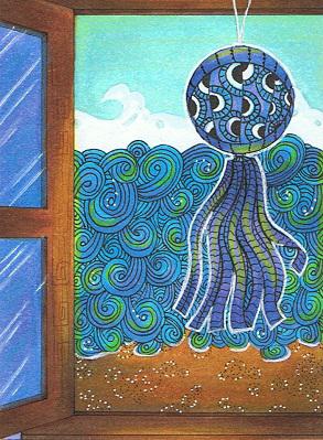 Am Fensterrahmen habe ich noch ein Tangle ergänzt, welches ich eigentlich von Anfang an benutzen wollte, aber bis eben nicht gewusste habe, wie und wo. Und an den Wellen und dem Windspiel sowie am Sandstrand (Tangle: Raindroppy) habe ich noch mit weißen Gelstift ausgebessert.